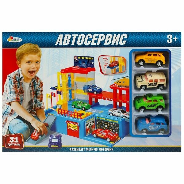 | Комплектация | 4 машины + комплекс-автосервис (автостоянка, гараж, подъёмник);,- 31 Деталь;,- С подвижными элементами:подъёмник для машин двигается вверх и вниз |