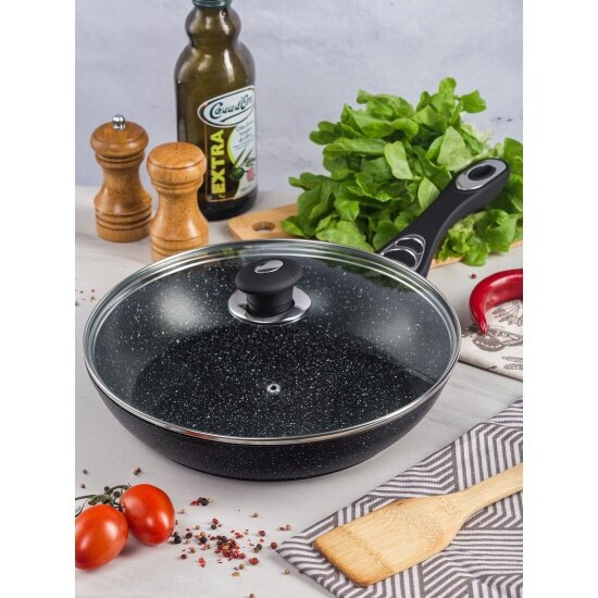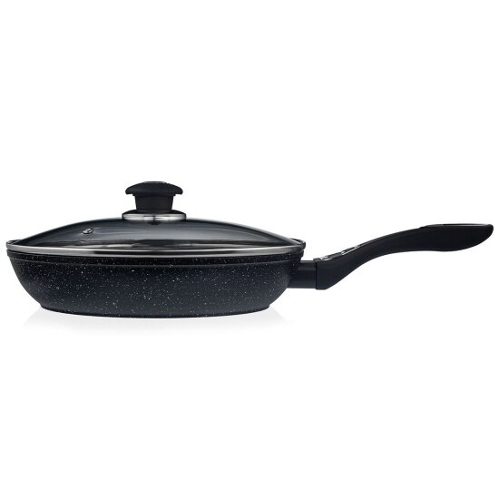 | Прочие особенности и свойства | Крышка с пароотводом, стеклянная Внутри черное антипригарное покрытие с рельефом Снаружи:жаропрочное лакированное покрытие. Подходит для всех плит, включая индукционные Материал:кованый алюминий с мраморным покрытием. Можно мыть в посудомоечной машине |