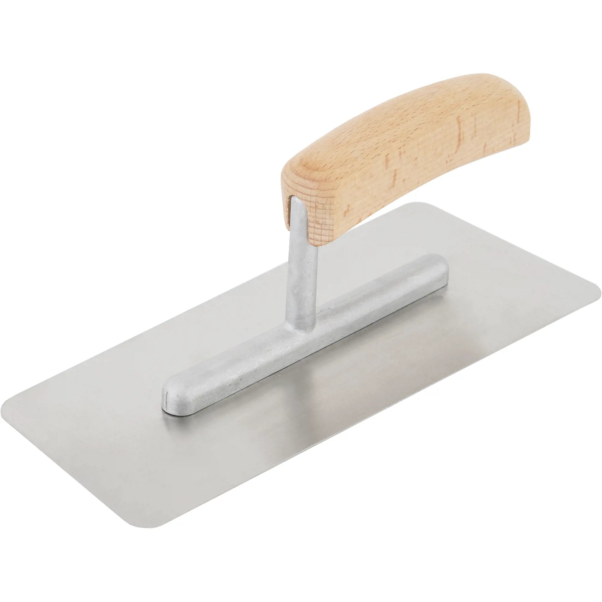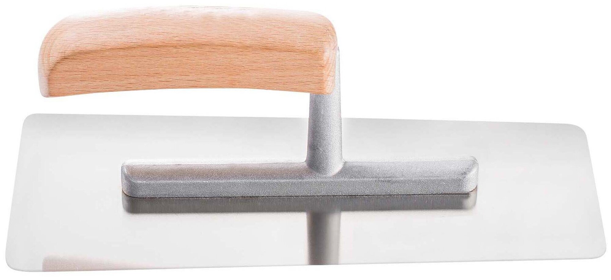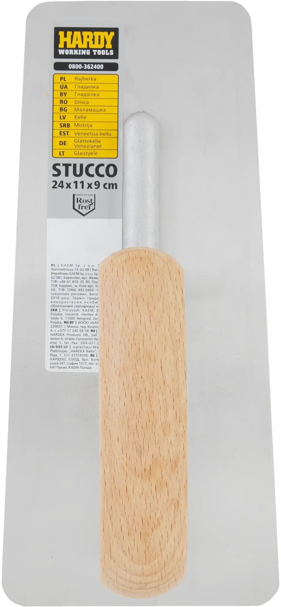 Гладилка Hardy Stucco 36 серии – инструмент для профессионального использования, предназначенный для распределения, выравнивания и заглаживания различных строительных растворов, штукатурных и клеевых смесей на стенах и потолках. Изделие со смесью прикладывают к обрабатываемой поверхности под углом и, равномерно распределяя силу давления, ведут в одном направлении. Ровное покрытие, получающееся в результате, обеспечивает качественное последующее нанесение отделочных материалов. Возможно использование изделия для устранения мелких дефектов на поверхностях, таких как трещины, стыки и щели, или их декоративной отделки, создавая на не высохшем слое различные фактуры.Рабочая часть, выполненная из прокатанной нержавеющей стали, представляет собой прямоугольный лист с ровными краями, закругленными углами и гладкой поверхностью. Деревянная двухкомпонентная ручка обеспечивает удобные хват и удержание инструмента. Легкий вес не создает дополнительной нагрузки на руки. Высококачественные материалы обеспечивают долгий срок службы. Гладилка Hardy Stucco 36 серии подходит как на подготовительных, так и на финишных этапах в штукатурно-отделочных работах.