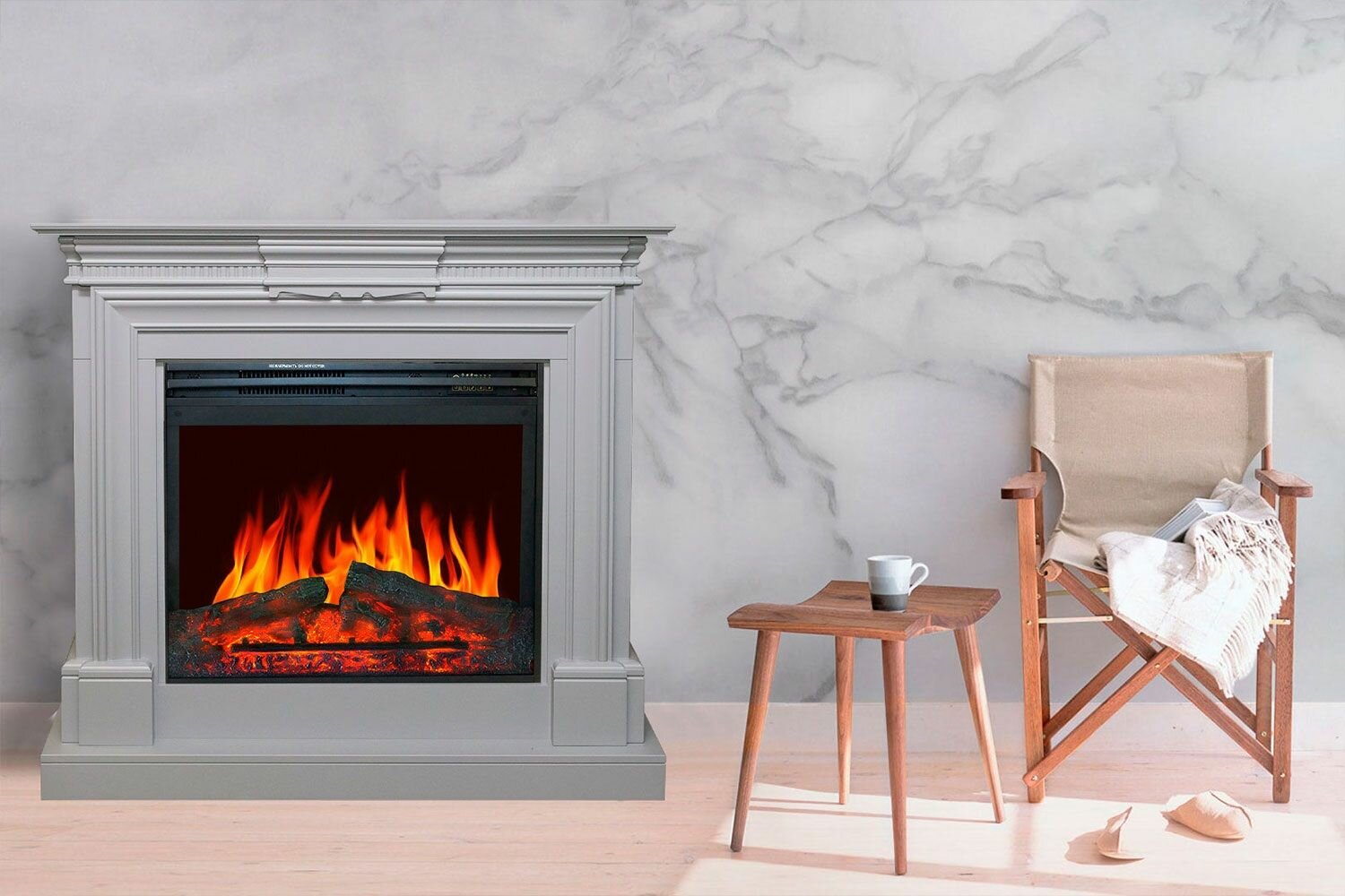 Для воссоздания иллюзии огня в очаге используются высокотехнологичные визуальные эффекты, светодиодные поленья в новом дизайне и звуковая имитация потрескивания дров.