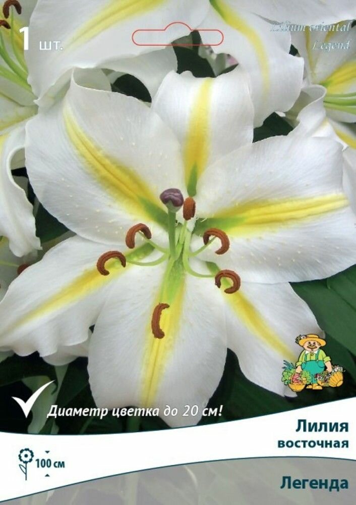 Легенда - высота растения 100 см, цветок белый с желтой полосой по центру лепестка и зеленцой у основания.