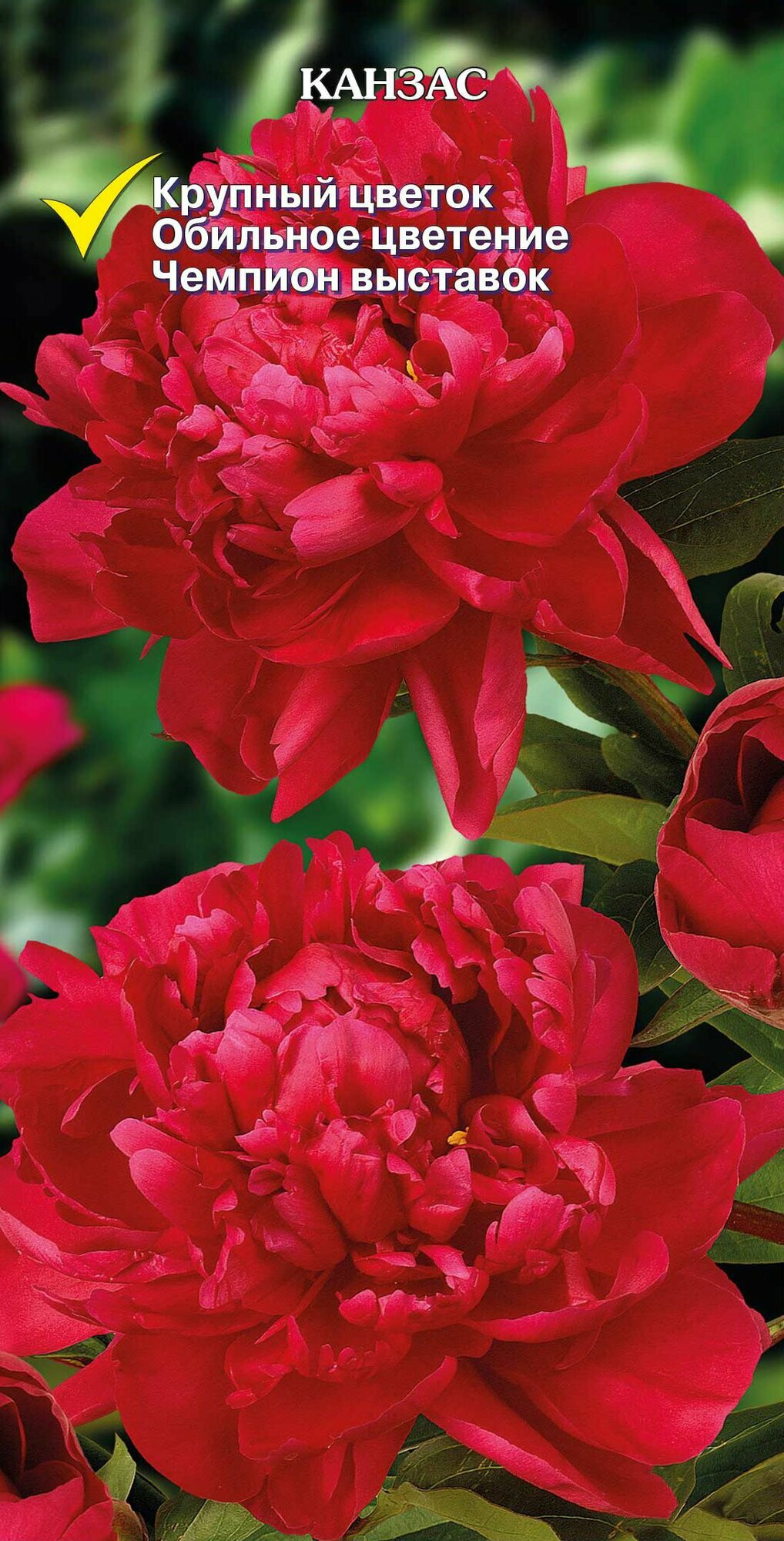 Канзас - высота растения 70-100 см. Срок цветения среднеранний. Цветок махровый, розовидный, 17-20 см в диаметре. Лепестки красные, плотно сложены. В зависимости от погодных условий форма и окраска цветка могут меняться. Цветение обильное. Бутон хорошо раскрывается. Золотая медаль Американского общества цветоводов 1957 г. Чемпион национальной выставки пионов США 1950 г.