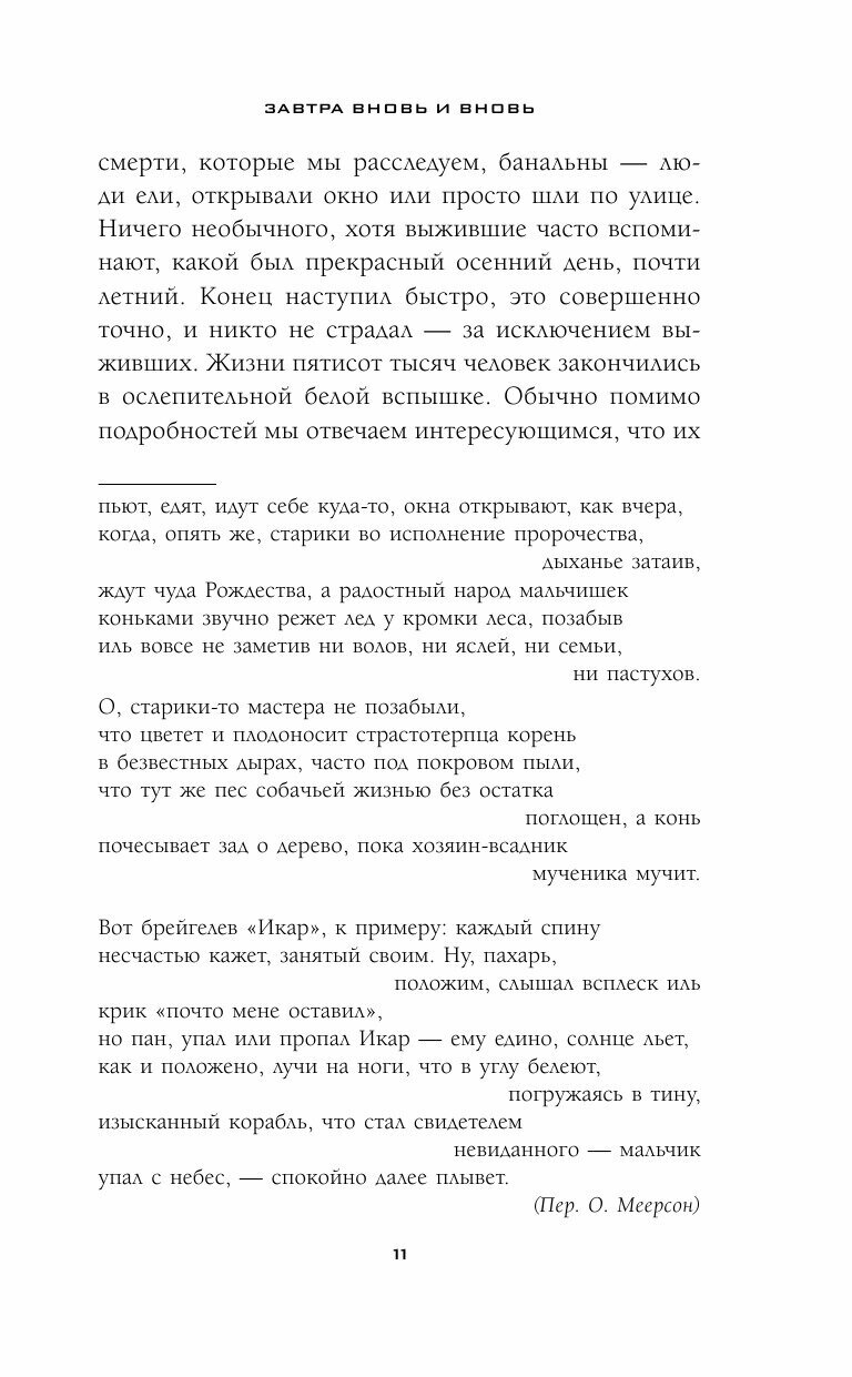 Тем сильнее было мое разочарование от другого произведения дяди Тома - «Завтра вновь и вновь», с которого он, как оказалось, и начал свою литературную карьеру. Мое почтение составителям аннотации – картину нарисовали радужную, не поспоришь. Она сулит тебе волнующее погружение в захватывающее, интригующее и динамичное повествование. Ты готов окунуться в этот обещанный яркий мир с головой, пройти все повороты замысловатых сюжетных линий, сопереживая героям, распутать вместе с ними интригу произведения до конца.