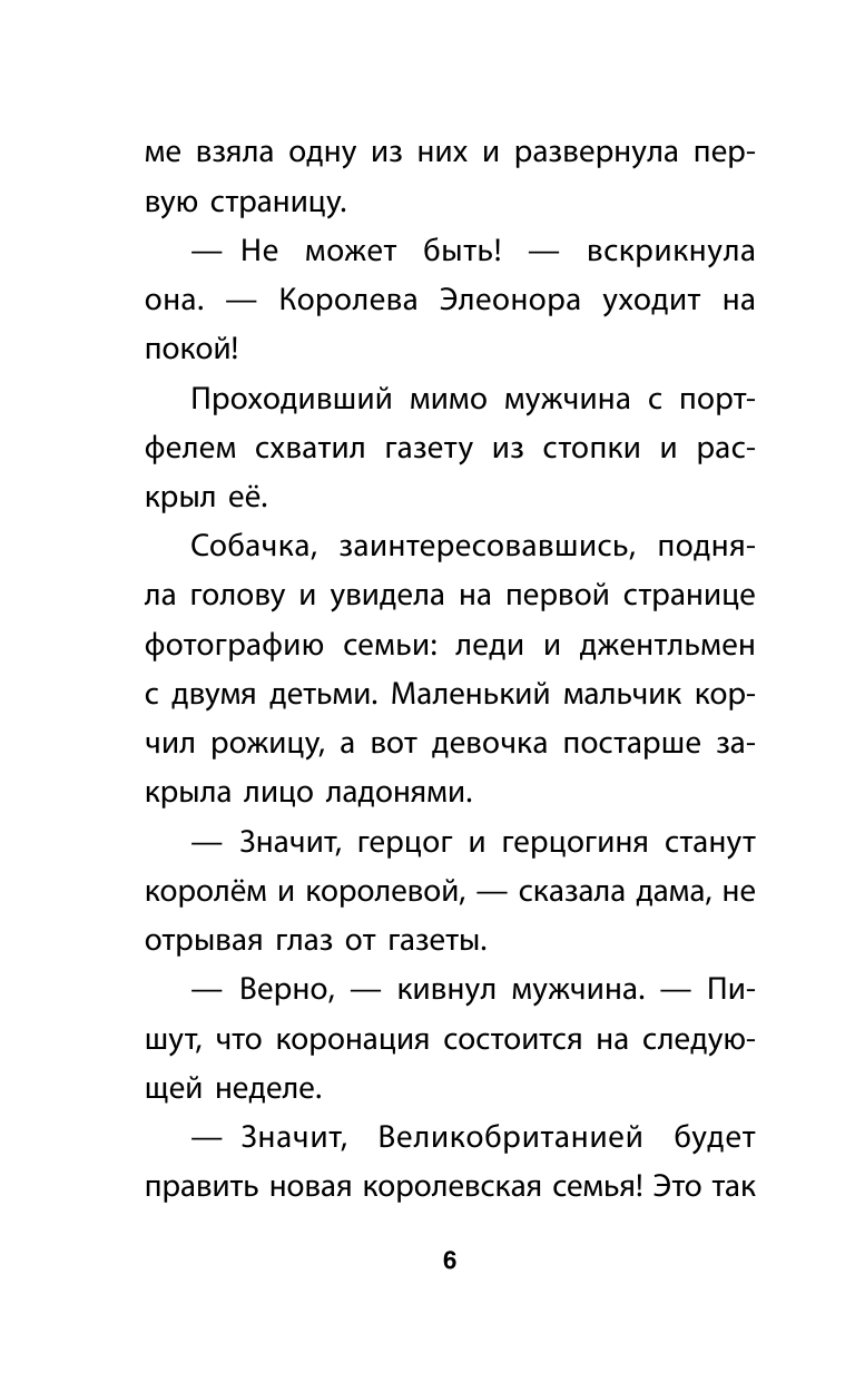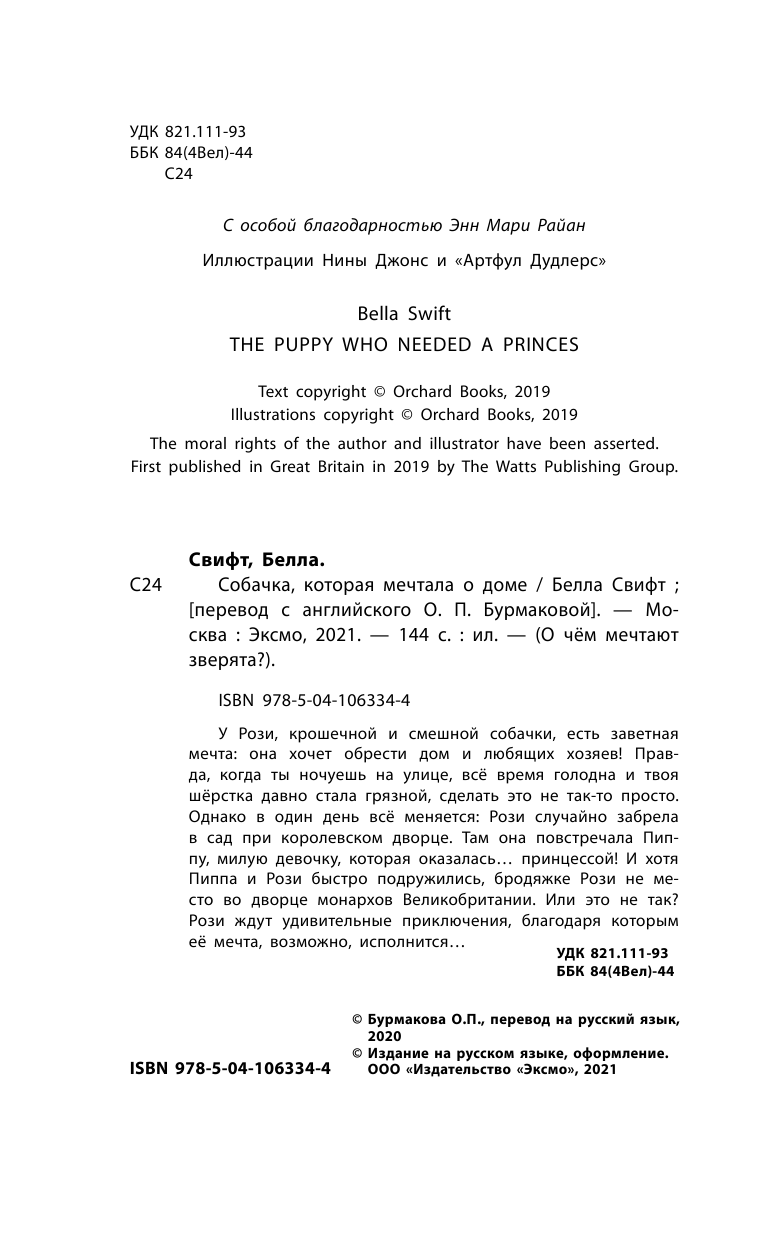Белла Свифт – известный в англоязычном мире автор. Ей удаётся вживаться в своих героев-животных и рассказывать истории, увиденные их глазами. Конечно, русскому читателю особенно повезло с переводчицей Ольгой Бурмаковой. Даже самому придирчивому взгляду не удастся выявить ни одной бросающейся в глаза речевой ошибки! Собачки в русской литературе занимают особенное место. Конечно, английская собачка – не Каштанка и не будущий Шариков. Это добрая собачка, которая хочет всего лишь крыши над головой. Судьба оказывается к ней великодушной: ей достается жизнь в королевском дворце! Её полюбила сама принцесса Пиппи! Во дворец можно попасть – если стремительно убежать от Королевской службы отлова животных – но трудно прижиться. Для этого нужно вовсе не собачьи манеры и особенная сноровка. Нужно оставаться самой собой, а это Рози удаётся: повинуясь собачьему инстинкту, она спасает сокровища и навсегда обретает расположение королевской семьи. Прекрасно переведенная, яркая и интересная сказка!