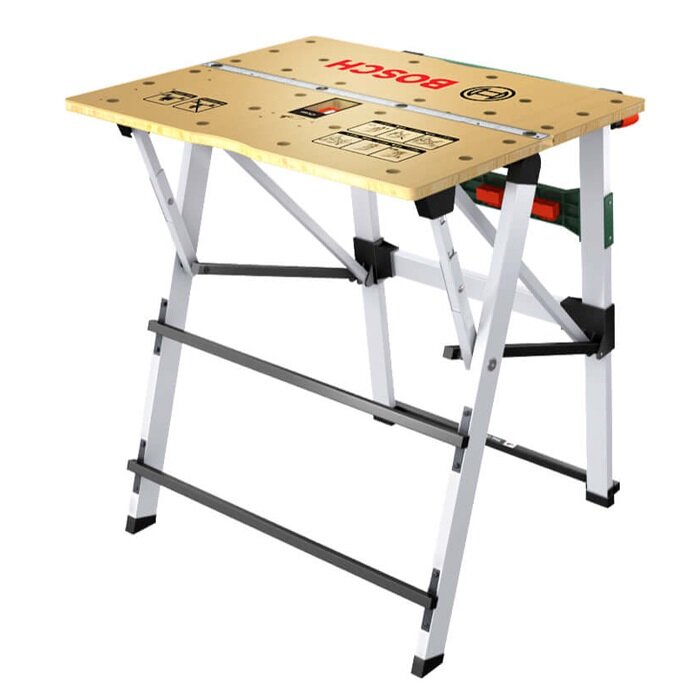 Универсальный верстак Bosch модель PWB 600 выступает мне за обычную рабочую поверхность в гараже. На нем есть разметка в виде линейки, что частенько помогает в измерения во время ремонта и для точной резки. Здесь есть две струбцины, что вполне позволяет не покупать такой инструмент и работать с этой поверхностью. Весит он конечно много, но при желании все же можно переставить на другое место.