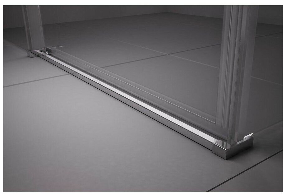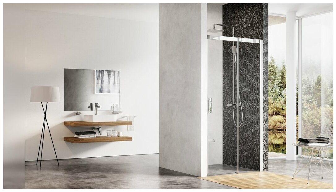 Роскошные раздвижные двери для Вашей ниши. Сделают герметичным душевое пространство шириной до 120 см. С помощью массивных профилей, верхнего и бокового, которые подчеркивают декоративные квадратные накладки, душевые двери придадут Вашей ванной комнате особый стиль.