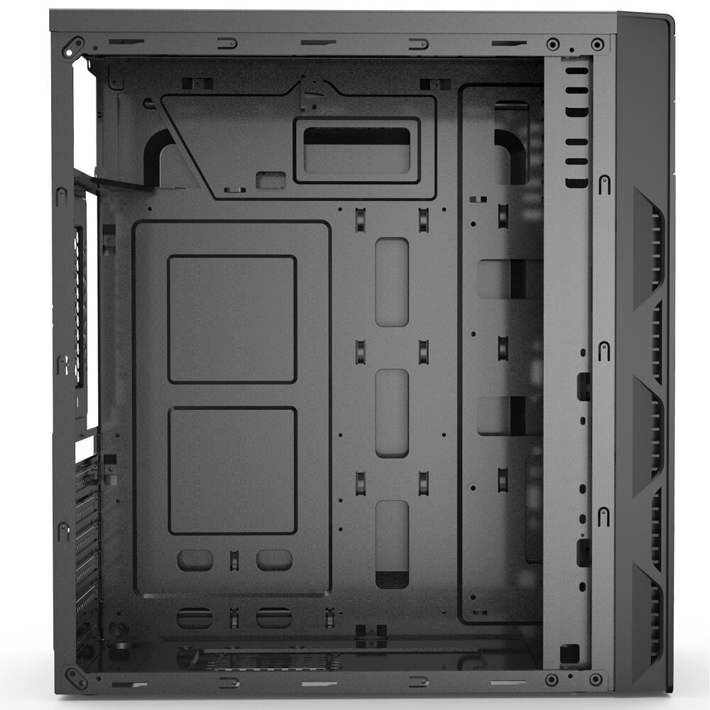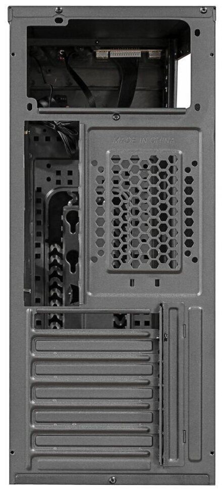 Корпус Ginzzu A190 выполнен из стали 0,45 мм в черном цвете. Он имеет отличную жесткость конструкции за счет 2-ной клепки узловых соединений с фигурным теснением. Наличие кабельных каналов дает возможность аккуратно проложить провода питания элементов ПК. Такая укладка придает элегантный вид собранного компьютера, обеспечивает беспрепятственный доступ воздуха к компонентам системы для ее качественного охлаждения.