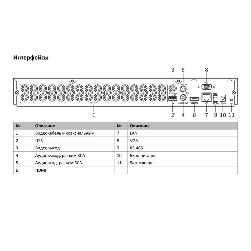 | Интерфейсы, порты и разъёмы | 32 х BNC, аудиовход (RCA), HDMI, VGA, CVBS, аудиовыход (RCA), RJ-45, USB 2.0, RS-485, 16 х тревожный вход, 4 х тревожный выход |