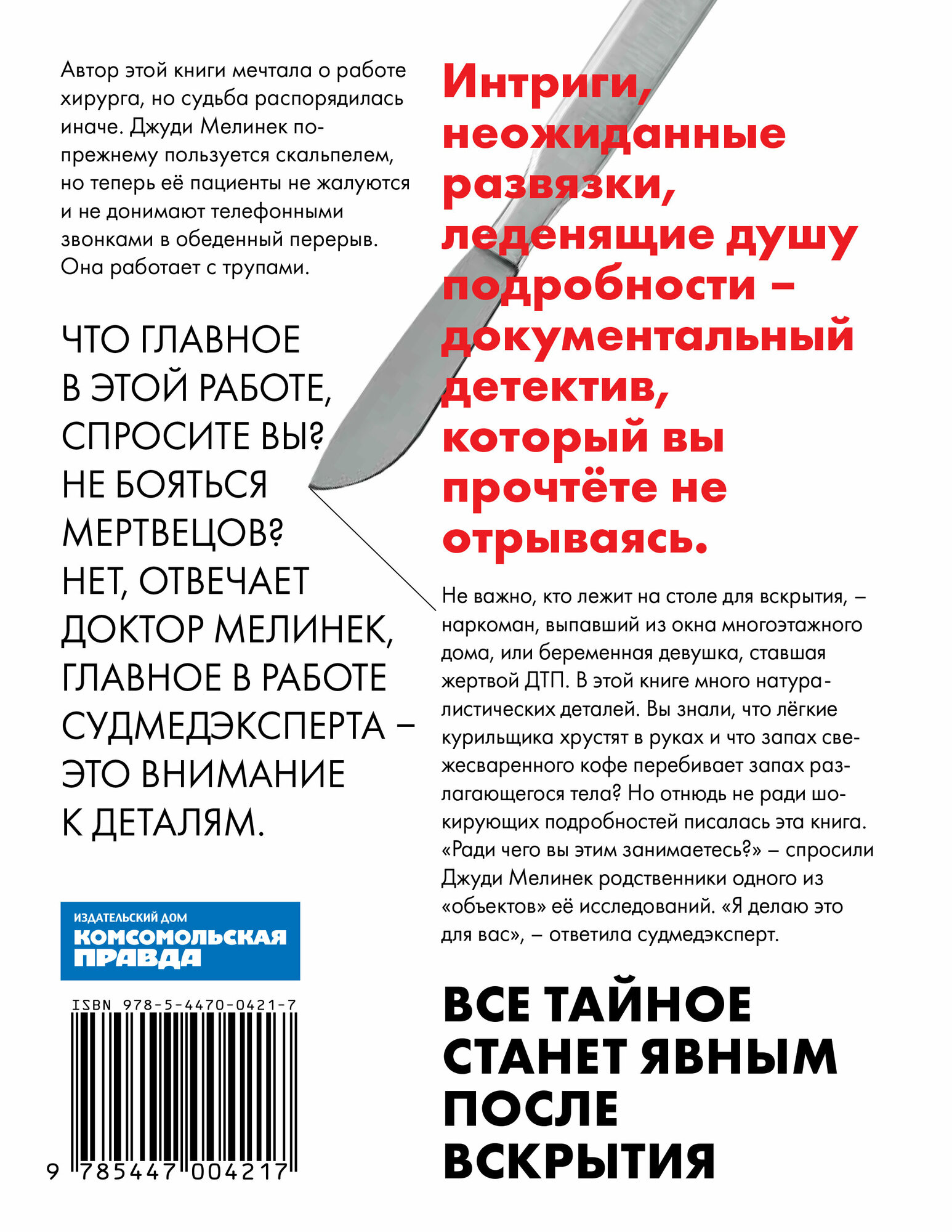 Автор книги мечтала о работе хирурга, но судьба распорядилась иначе. Джуди Мелинек по-прежнему пользуется скальпелем, но теперь ее пациенты не жалуются и не донимают ее телефонными звонками в обеденный перерыв. Она работает с трупами.
