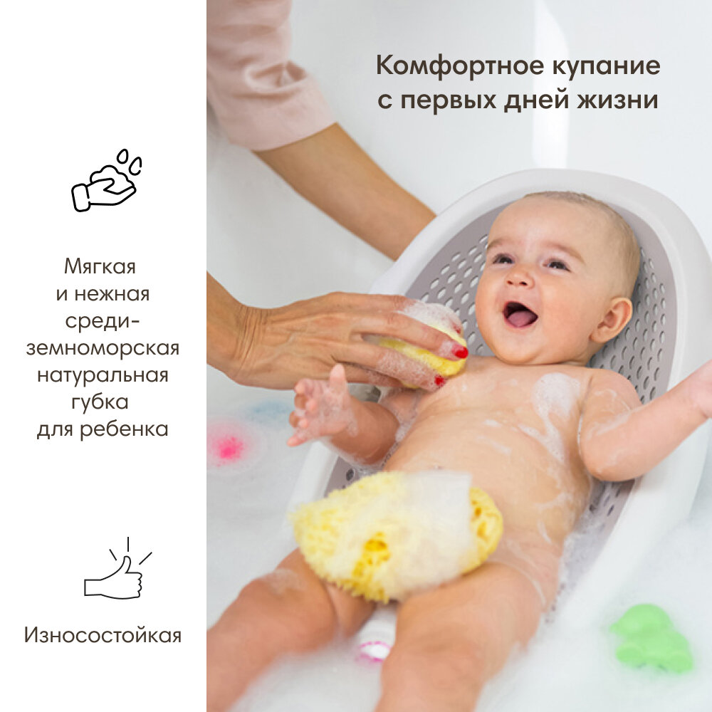 Комфортное купание с первых дней жизни. Мягкая и нежная средиземноморская натуральная губка для ребенка. Протестирована и одобрена дерматологической клиникой Сиены. Доступна в двух вариантах:Толстая губка: мягкая, нежная и износостойкая, идеально подойдет для расслабляющей ванны или душа.Тонкая шелковая губка: особенно подходит для новорожденных младенцев и малышей с чувствительной кожей.