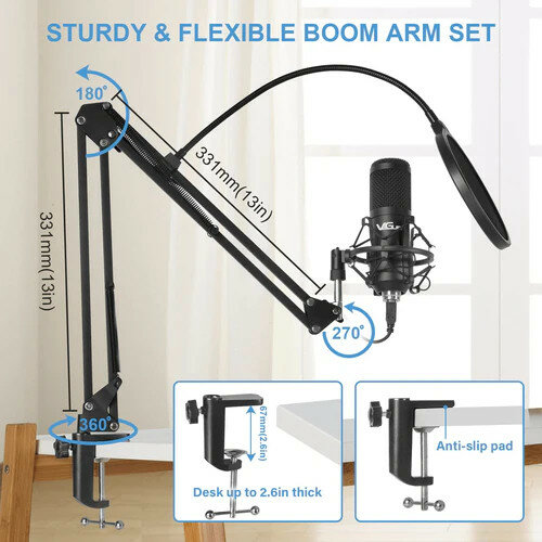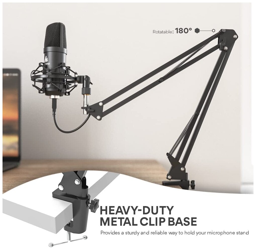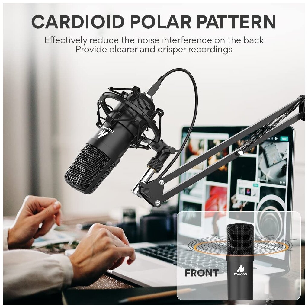 Микрофонный комплект Maono AU-A04 способен обеспечить достижение чистого звука в студийных условиях. В комплекте предусмотрены подвесной микрофон, антивибрационный подвесной механизм паук и пантограф. Благодаря применению поп-фильтра и ветрозащите голос записывается без постороннего шума. Амортизатор способствует поглощению вибрации и устраняет колебания. Для подключения к ПК и прочей аппаратуре в Maono AU-A04 используется съемный кабель, который отличается увеличенной длиной 2.5 метра и разъемом USB.
