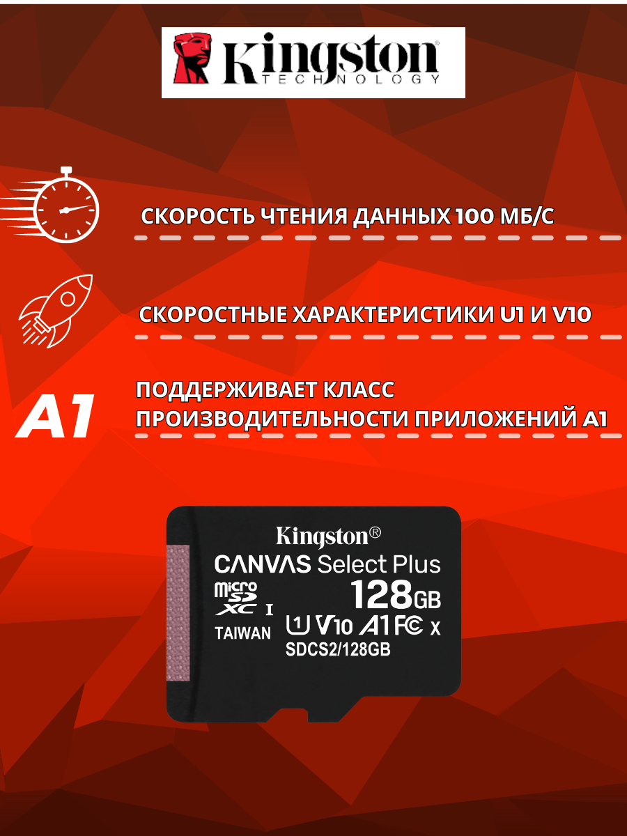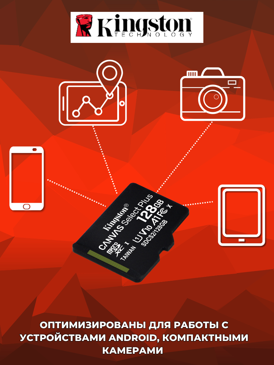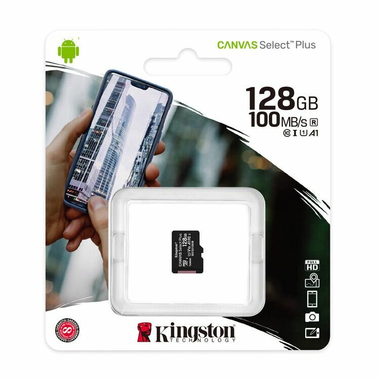 | Описание | Kingston Canvas Select Plus microSDXC 128GB SDCS2/128GBSP; Flash:microSDXC 128ГБайт A1, Class 10, UHS-I (U1) |