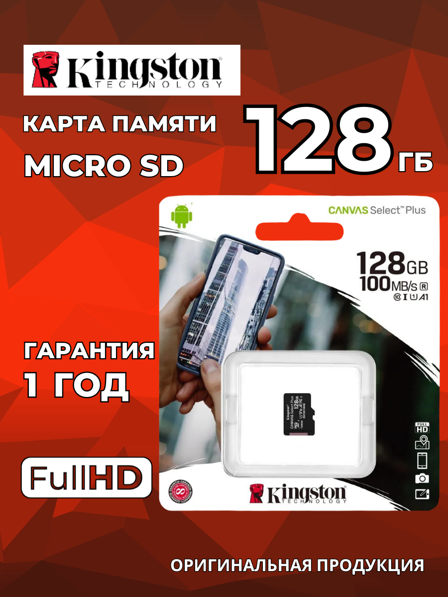 Карта памяти MicroSD Kingston microSDHC/SDXC UHS-I Class 10 Canvas Select Plus128Gb