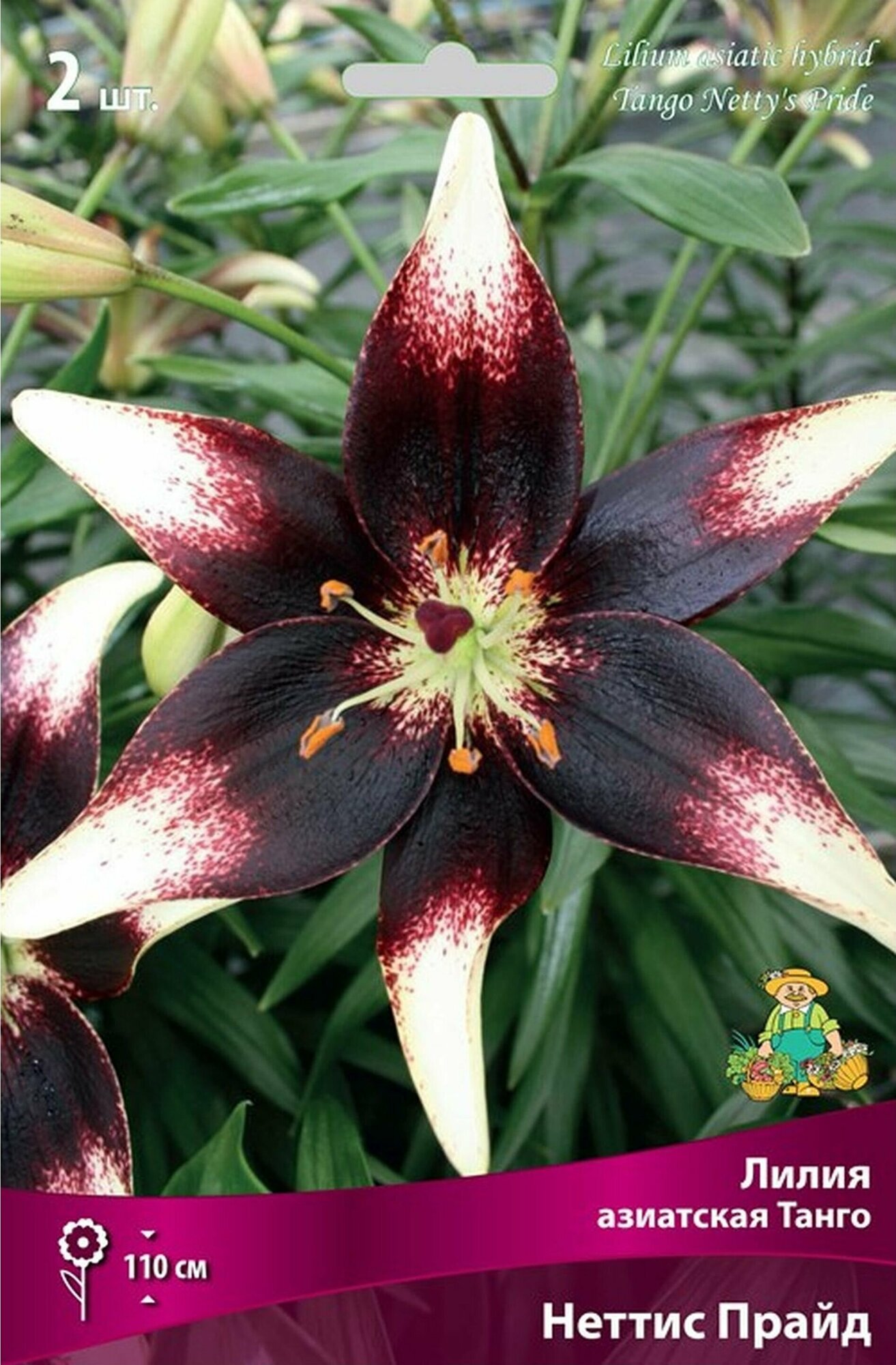 Лилия Танго Неттис Прайд - высота растения 110 см, центр темно-бордовый, к середине светлее, концы белые. Азиатские гибриды группы Танго отличаются сильно выраженным обильным крапом на лепестках: иногда этот крап может сливаться в сплошное контрастное пятно в центре цветка. Они довольно неприхотливы, отличаются морозостойкостью, быстро и легко размножаются. Цветут во второй половине июня-июле. Пригодны для выгонки во внесезонное время. Рекомендации по посадке луковичных цветов