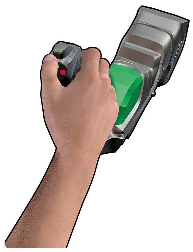 Бластер выглядит очень стильно. У него серый стальной корпус с рельефными деталями, удобная ручка и рычаг для активизации функций, яркие кнопки, которые помогут определять виды монстров, а также переключатель уровней сложности.