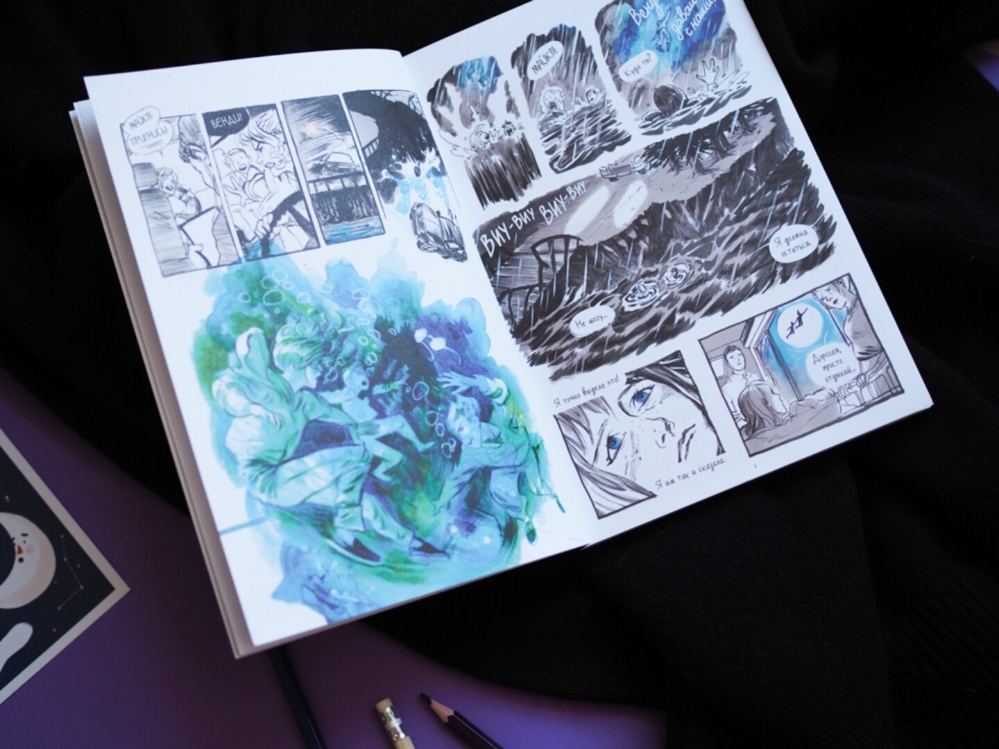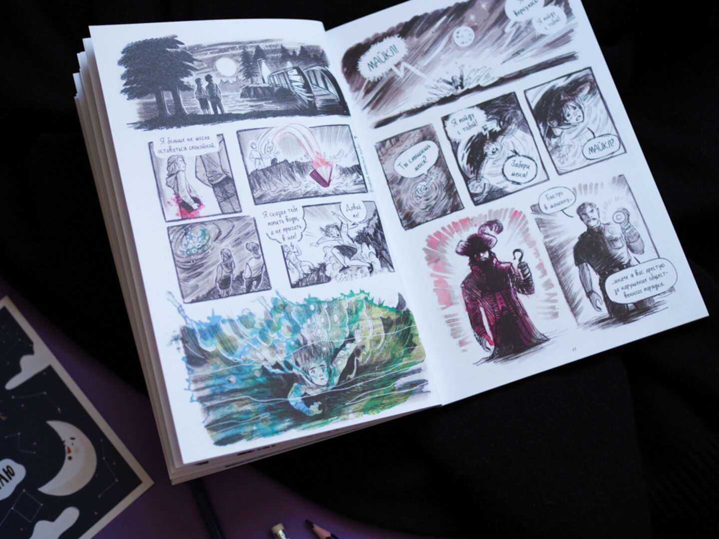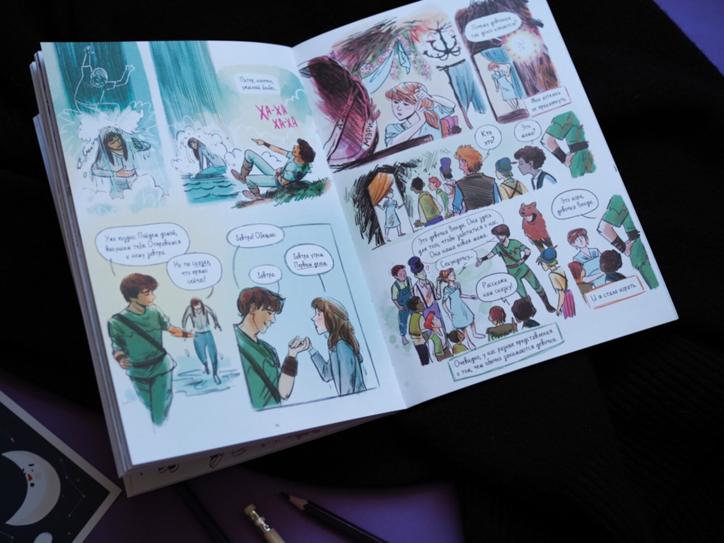 Зато фантазии Венди яркие и детализированные. Карта Нетландии в ее комнате, книга о Питере Пэне, вещи погибшего брата цветные. Растекающиеся акварельные пятна оживляют черно-белую графику, привнося в нее магию сказки.