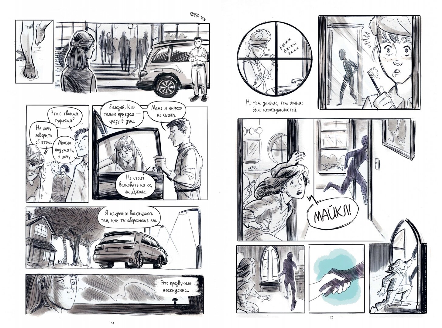 История столь же прекрасно нарисована — с одной стороны просто, подражая стилистике девочкового дневника (который всучает ей терапевт), с другой — довольно артистично, с умелым вкраплением буйных красок, образов и необходимых деталей. Очень здорово был подобран шрифт в нашей локализации. Прямо как от "Грамерси парка", от книги сложно оторваться — благо, в ней тоже около сотни страниц, можно прочесть за вечер. Произведение касается темы утраты близкого человека, но оно совершенно не депрессивное, грусть здесь максимум светлая ("Элвис не умер, он просто улетел домой"). Для полноты картины хорошо бы иметь представление о "Питере Пэне", хотя бы в общих чертах (чтобы понимать, к примеру, почему Венди оставляет каждую ночь окно открытым). Ну и осторожно, в других отзывах бессовестные спойлеры.