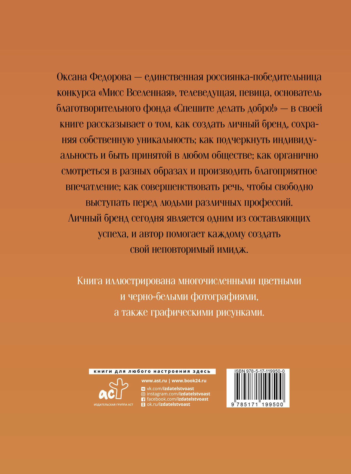 Оксана Федорова - единственная россиянка-победительница конкурса "Мисс Вселенная", телеведущая, певица, основатель благотворительного фонда "Спешите делать добро!" - в своей книге рассказывает о том, как создать личный бренд, сохраняя собственную уникальность; как подчеркнуть индивидуальность и быть принятой в любом обществе; как органично смотреться в разных образах и создавать о себе благоприятное впечатление; как совершенствовать речь, чтобы свободно выступать перед людьми различных профессий.