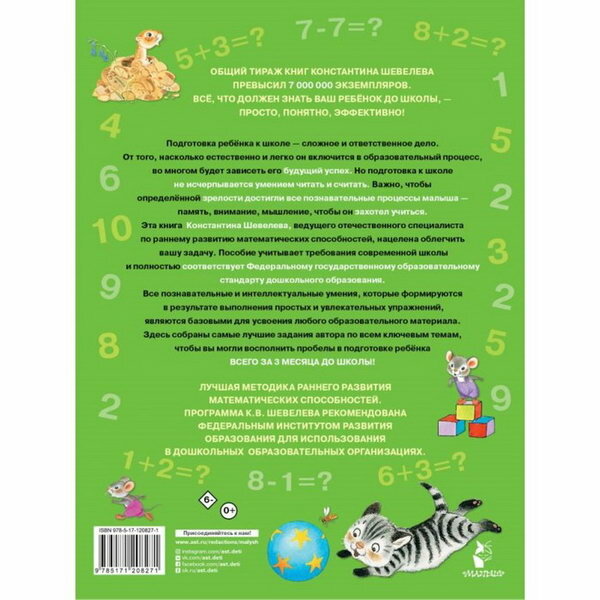 Подготовка ребёнка к школе - сложное и ответственное дело. От того насколько естественно и легко он включится в образовательный процесс, во многом будет зависеть его будущий успех. Но подготовка к школе не исчерпывается умением читать и считать. Важно, чтобы определённой зрелости достигли все познавательные процессы малыша - память, внимание, мышление, чтобы он захотел учиться. Эта книга Константина Шевелева, ведущего отечественного специалиста по раннему развитию математических способностей, нацелена облегчить вашу задачу. Пособие учитывает требования современной школы и полностью соответствует Федеральному государственному образовательному стандарту дошкольного образования. Все познавательные и интеллектуальные умения, которые формируются в результате выполнения простых и увлекательных упражнений, являются базовыми для усвоения любого образовательного материала. Здесь собраны самые лучшие задания автора по всем ключевым темам, чтобы вы могли восполнить пробелы в подготовке ребёнка всего за 3 месяца до школы!