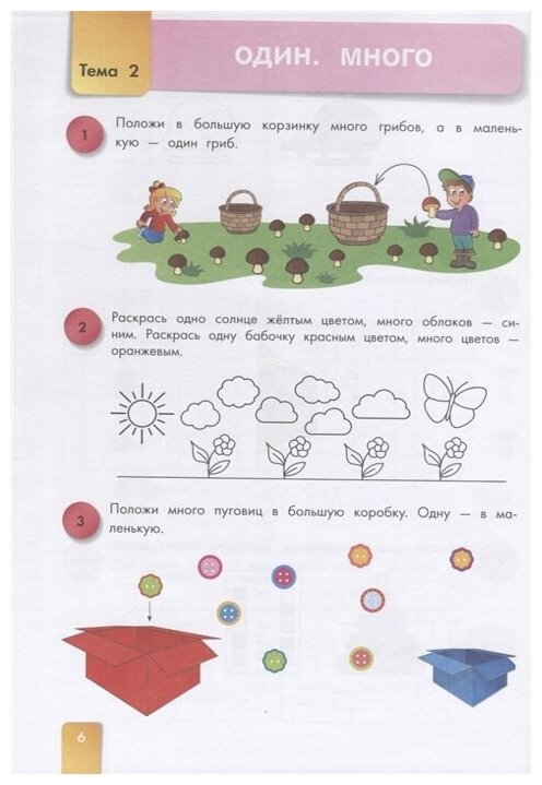 Купили книгу по рекомендации учителя для подготовки к школе. Всего в учебнике 40 тем, в каждой из которых ребенку предлагается выполнить 6 заданий. Яркие красочные иллюстрации привлекают внимание учащегося и помогают в освоении материала, а разнонаправленные задания не позволяют ребенку заскучать. Для печати книги использована плотная белая бумага, писать и рисовать на ней удобно. Занимаемся с удовольствием, особенно ребенку нравится в конце занятия отмечать задания, которые он выполнил сам без помощи взрослых (в учебнике для этого есть специальные странички с домиками, где каждой теме отведен отдельный домик с окошками по количеству занятий урока).