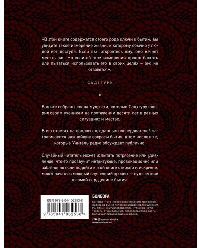 Безусловно, самая глубокая книга Садхгуру - и не только. Это редчайший кладезь знаний о жизни и смерти и пояснений, которые духовные учителя не всегда дают даже ближайшим ученикам. Здесь Садхгуру действительно отвечает на все вопросы – от финансового благополучия до метафизики смерти, и делает это поразительно открыто и обстоятельно.