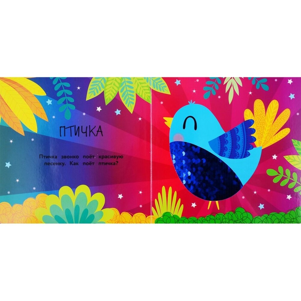 Когда я увидела, что книга с пайетками, то решила, что для моей полуторогодавалай дочурки книга будет полезной, позновательной, а птичек выложенных пайетками можно будет потрогать, погладить в разнын стороны от чего они поменяют цвет, ну чем не плохо для мелкой моторики.