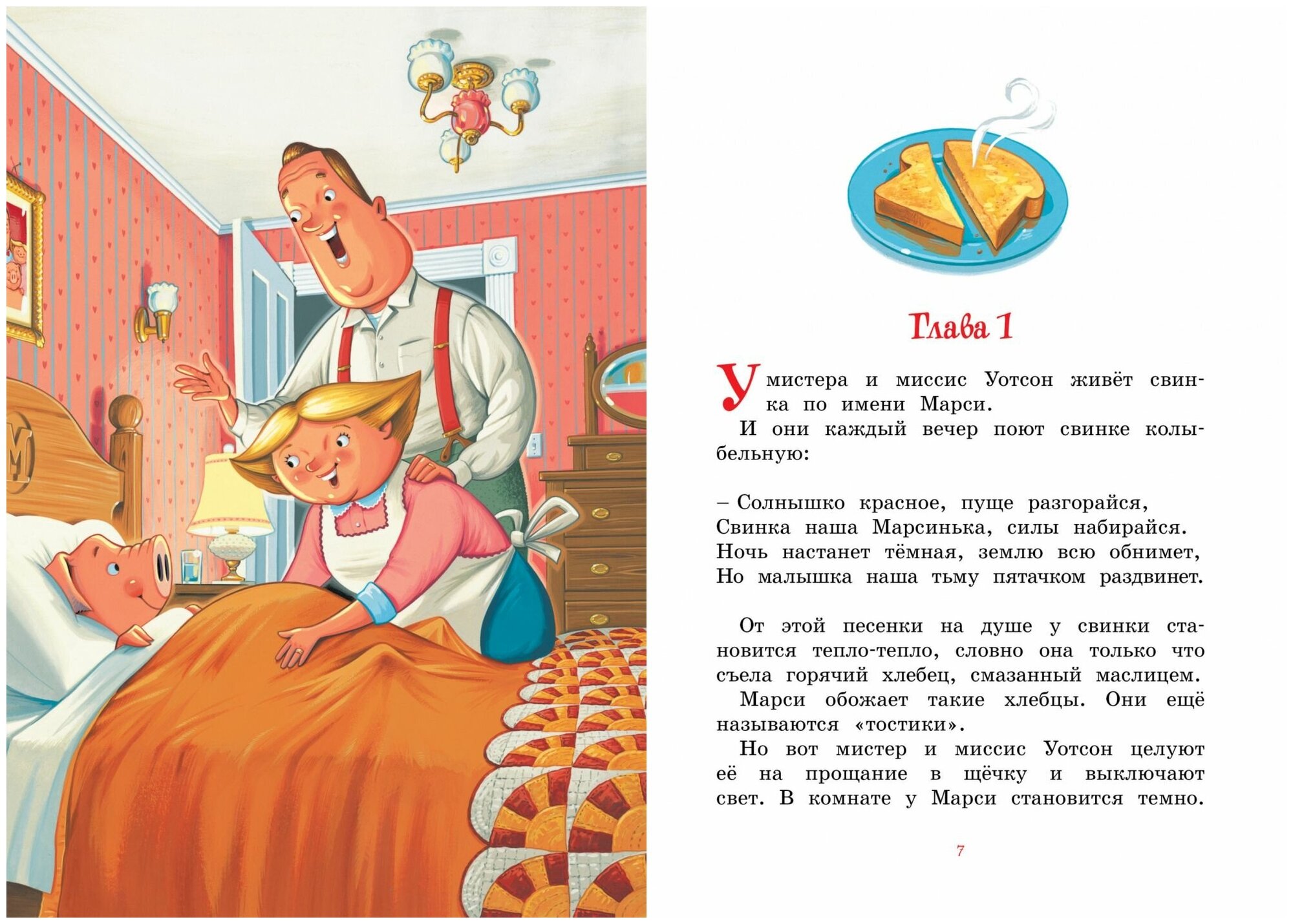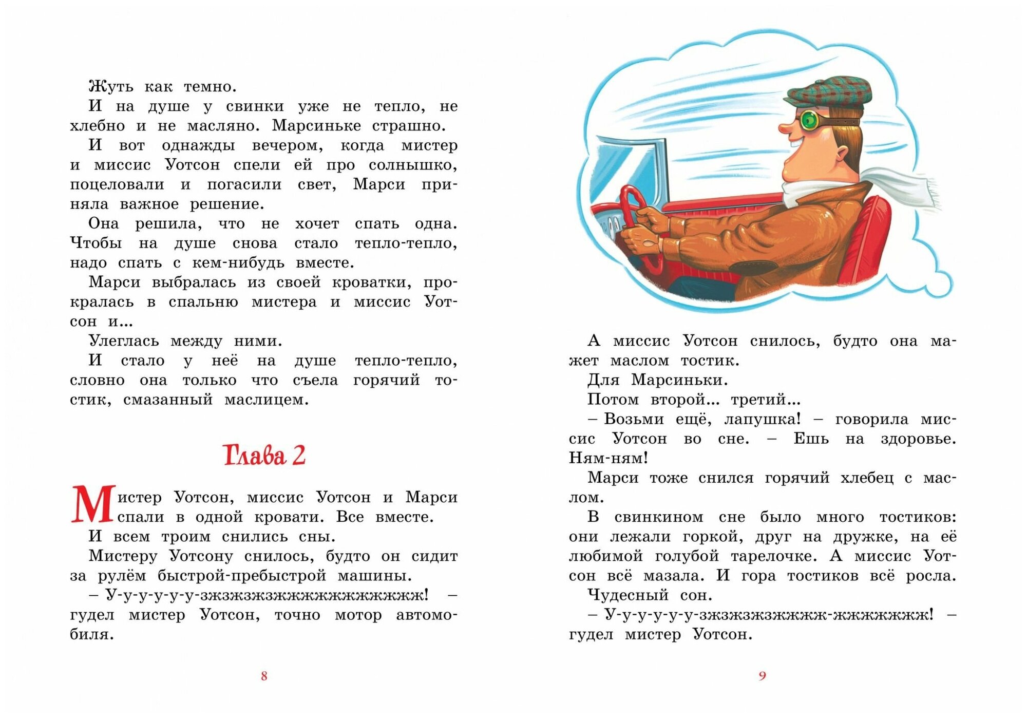 У мистера и миссис Уотсон живёт свинка по имени Марси, которая больше всего на свете любит тостики с маслицем. Эта весёлая и неутомимая озорница просто обожает проказничать – то посреди ночи учинит дома настоящий погром, то вдруг ей вздумается прокатиться на автомобиле и даже порулить, а однажды она нарядилась принцессой и устроила в округе переполох, загнав на дерево грозного кота по кличке Генерал Вашингтон…