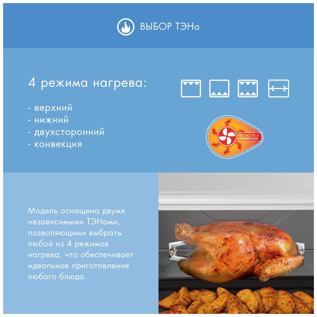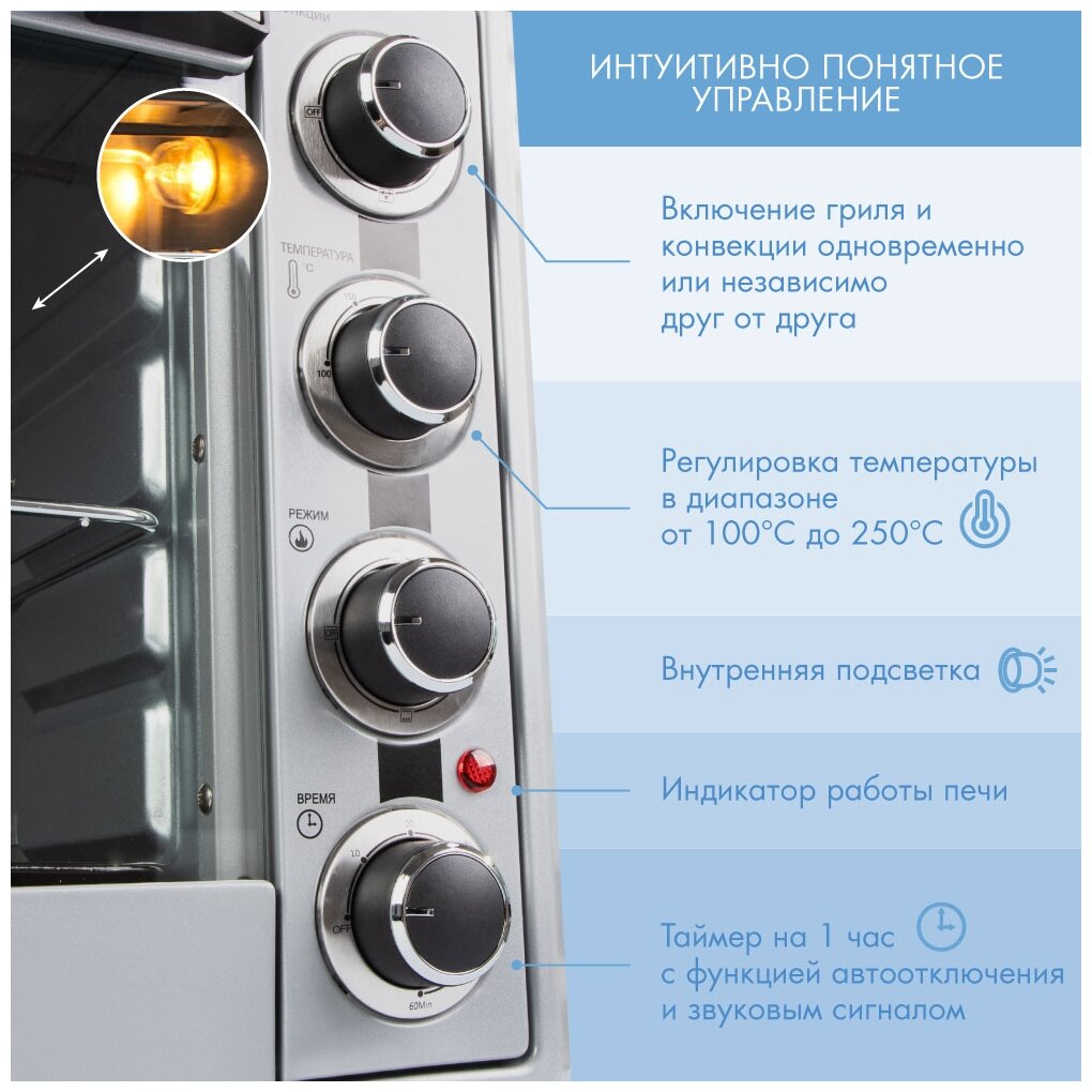 | Прочие особенности и свойства | Нагревательные элементы из нержавеющей стали Индикатор работы печи Большая дверца и удобная ручка с декоративной стальной вставкой Регулировка температуры в диапазоне от 100°С до 250°С Таймер на 1 час с функцией автоотключения и звуковым сигналом Четыре режима нагрева:верхний, нижний, двухсторонний, конвекция |