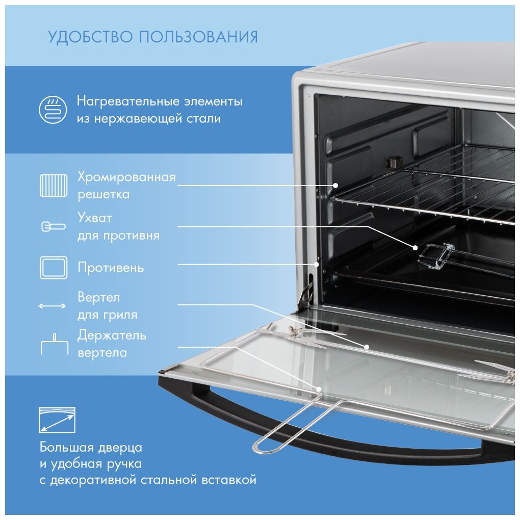 Внутренний объем мини-печи составляет 65 литров - вы сможете разместить в ней большое количество пищи.