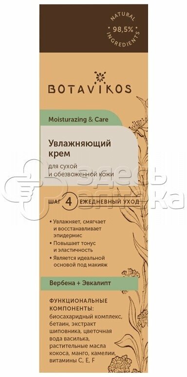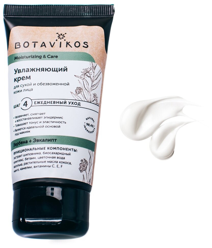 | Полное описание | Botavikos - Крем увлажняющий с вербеной и эвкалиптом - для сухой и обезвоженной кожи. Средство для ежедневного направленного ухода за кожей, склонной к сухости и шелушению. Гарантирует долгосрочное увлажнение и защиту эпидермиса от внешних факторов, возвращает ровный и здоровый цвет лицу. Благодаря растительным маслам в составе крем бережно ухаживает за кожей, прекрасно смягчает, регулирует водно-липидный баланс, служит природным уф-фильтром. Биосахаридный комплекс отвечает за интенсивное увлажнение и обеспечивает антиоксидантную защиту кожи. Идеально подходит в качестве основы под макияж, сохраняя кожу увлажненной и защищенной в течение всего дня. Активные ингредиенты: экстракт вербены и эвкалипта, биосахаридный комплекс. Способ применения: Нанесите крем на кожу по массажным линиям, предварительно очищенную средствами Moisturizing & Care (шаг 1 и 2), позвольте средству полностью впитаться. Рекомендуется использовать в качестве ночного или дневного средства для ежедневного поддерживающего ухода. |
