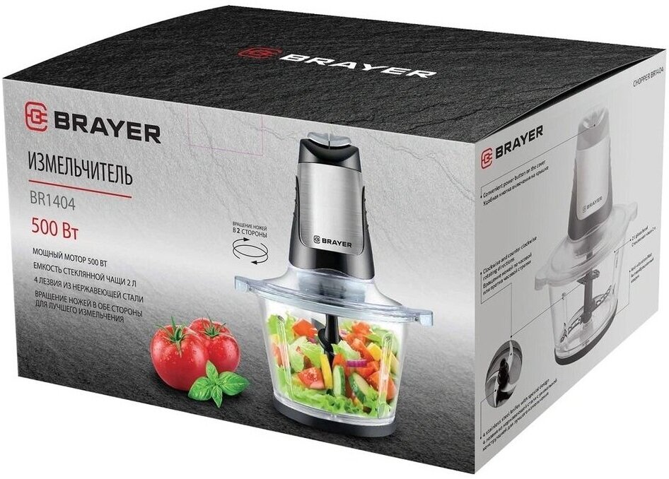 Измельчитель Brayer 1404BR мощностью 500 Ватт и емкостью чаши 2 литра отлично подходит для измельчения различных продуктов. В вашем распоряжении импульсный режим и универсальный нож. Есть защита от перегрузок. Чаша для измельчения выполнена из стекла.