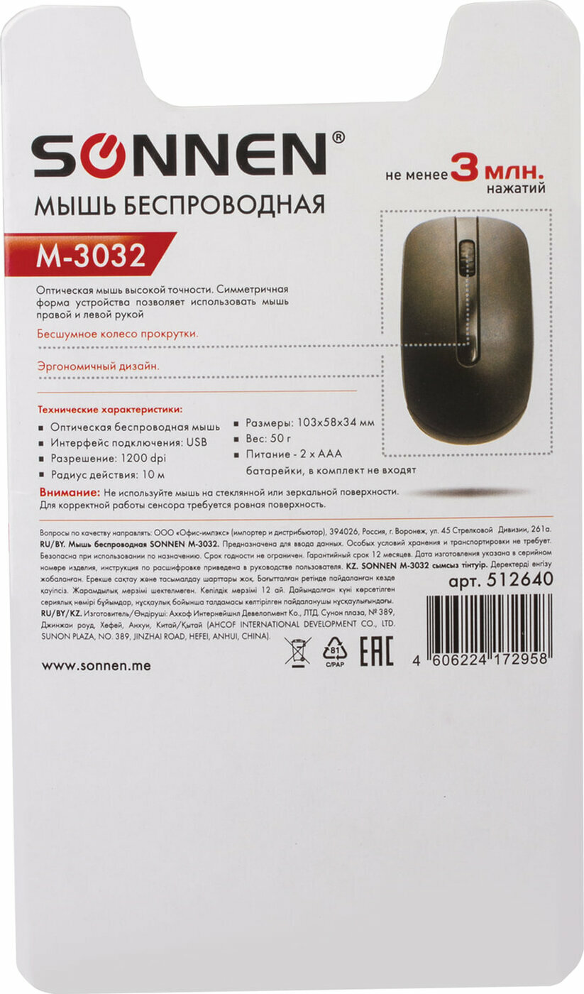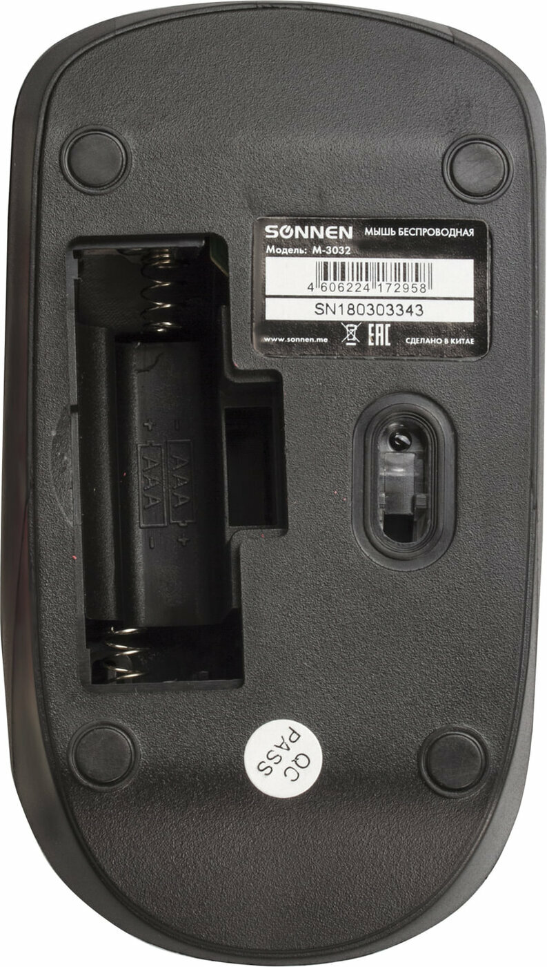 Мышь беспроводная SONNEN M-3032 USB 1200 dpi 2 кнопки + 1 колесо-кнопка оптическая черная 512640