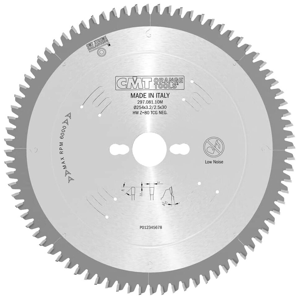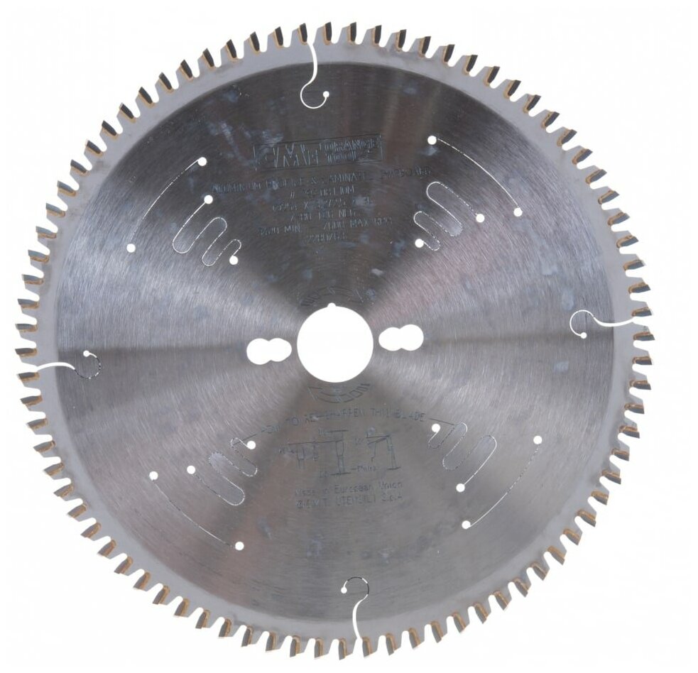 Диск пильный CMT 297.081.10MДизайнеры и технологи компании CMT представляют пилу по цветным металлам. Основными особенностями являются высокая ударная вязкость зубьев из специального сплава, трапецеидальная заточка для долговечности и малая высота зубьев для более надежного крепления. Отрицательный угол врезания 6° позволяет контролировать процесс пиления и оставлять гладкие аккуратные края заготовки без замятия тонких деталей. Специальная конструкция пазух для эффективного удаления стружки.Пилы по цветным металлам компании CMT идеальны для торцовочных пил. Оптимальны для работ по алюминию, меди, другим не содержащие железа металлам.Применение: пиление и разрезание труб, формованных деталей и брусков.Оборудование: торцовочная пила, консольная пила; 296 серия для ручных циркулярных пил.Материал: Алюминий, медь, медный сплав, пластик, композитные материалы, ламинированные панели.Предупреждение: рекомендуется использовать жидкую смазку; восковые смазки использовать НЕ рекомендуется!Технические параметры твердосплавных зубьев:- высота зуба, мм: 6-8- сплав, марка: K10- степень твёрдости (HV10): 1,765- сопротивление поперечному разрыву (N/мм2): 2,150
