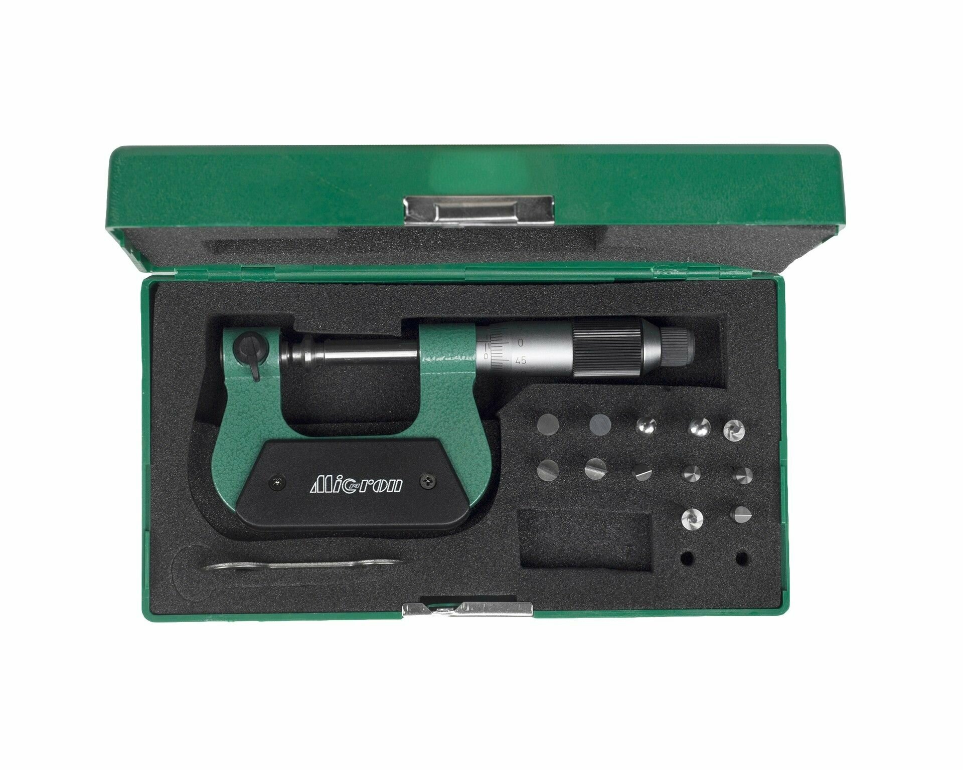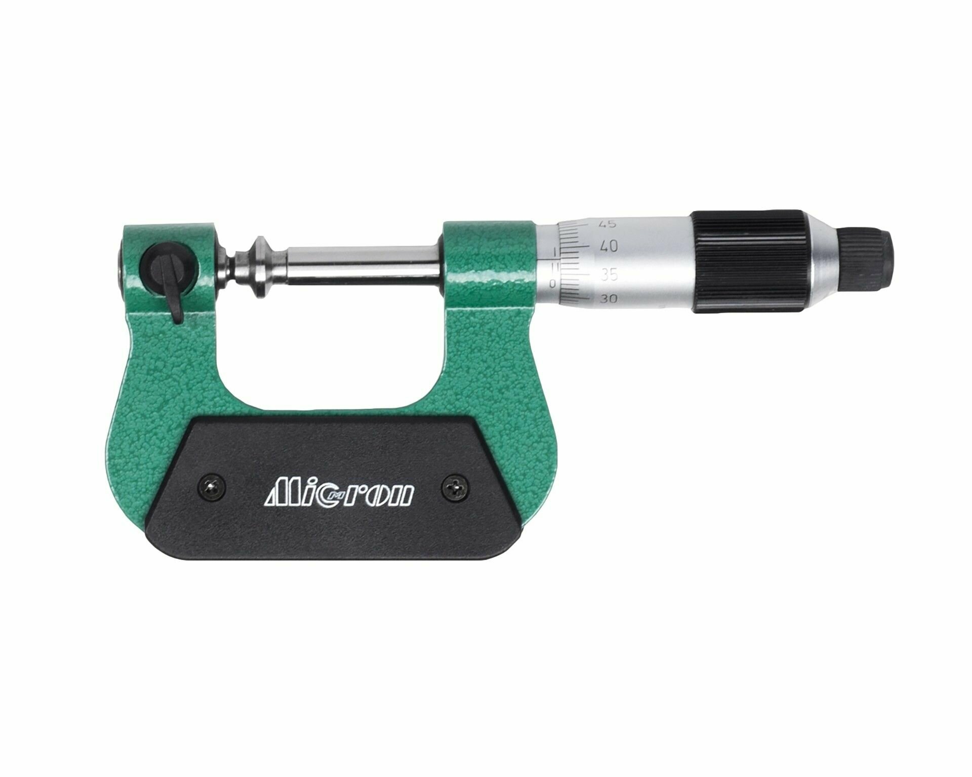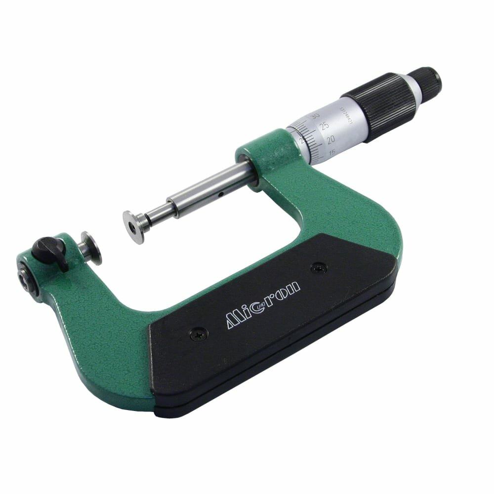 Микрометр со вставками Micron оснащен широкими тарельчатыми губками, которые позволяют измерять ширину и толщину зубцов, а также элементов, расположенных вблизи других конструктивных выступов детали.