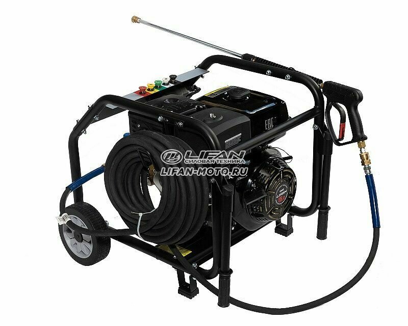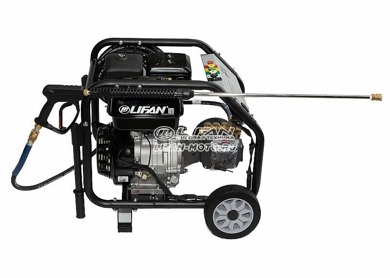 Этот аппарат является самым мощным в линейке моек высокого давления, производимых компанией Лифан. Прим этом масса мойки в собранном рабочем состоянии составляет всего 49 килограмм, что достаточно немного, учитывая высокие мощностные характеристики агрегата. Мойка оснащена эргономичной складной ручкой и большими пневматическими колесами, что позволяет быстро, удобно и без особых усилий перемещать ее к месту работы на местности. На мойке используется высококачественный насос высокого давления с прямым приводом Annovi Reverberi. Данная модель оснащена только ручным запуском двигателя. Мойка может быть подключена как к водопроводной сети, так и в состоянии работать, выполняя забор воды из различных емкостей, при условии забора воды выше уровня самой мойки. Аппарат оборудован специальным сифоном для подачи химических моющих средств (шампуней), который позволяет осуществлять автоматическую регулируемую подачу во время процесса мойки. Мойка оснащена четырехтактным бензиновым двигателем Лифан, мощностью 9 лошадиных сил, достаточно мощным, экономичным и при этом крайне простым в эксплуатации и надежным агрегатом. Давление струи воды на выходе из пистолета достигает 232 килограмм на квадратный сантиметр. Расход воды при максимальном режиме работы достигает 11,4 литров в минуту. Пистолет мойки оснащен распылителем с возможностью выбора формы выходной струи воды.