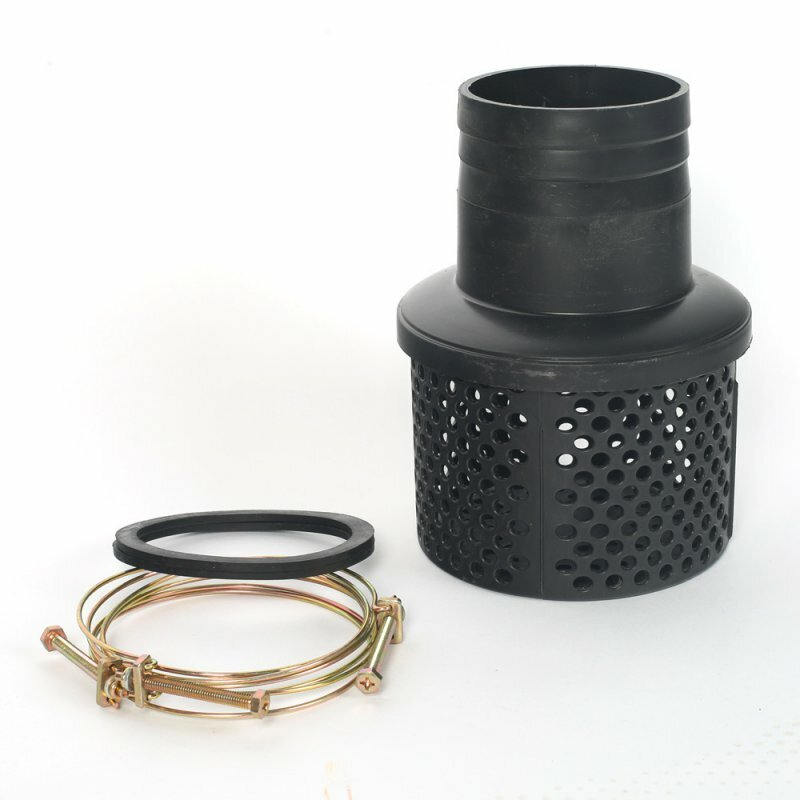 Комплект: переходники на всасывающий и подающий шланги, хомуты, сетка-фильтр на всасывающий шланг.