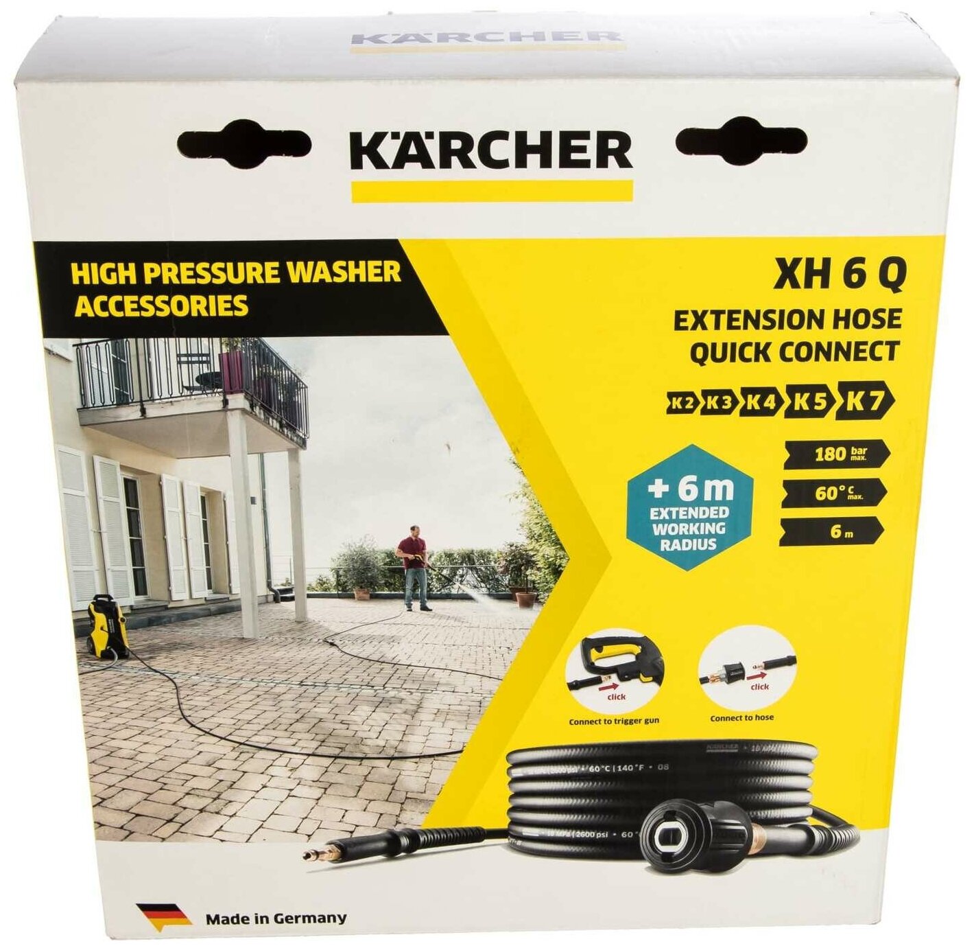 Увеличивает радиус действия аппарата высокого давления на 6 метров. Легко устанавливается между аппаратом с быстродействующим разъемом (Quick Connect) и штатным шлангом высокого давления. Прочный шланг DN 8 с текстильной оплеткой, защитой от перегиба и долговечным латунным соединительным элементом, пригодный для работы с чистящими средствами. Выдерживает температуры до 60 °С, давление до 160 бар.