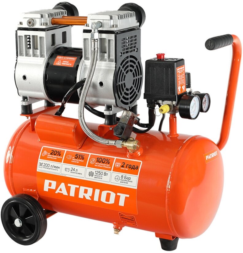 Компрессор Patriot - компактный и тихий безмасляный двухпоршневой компрессор, обеспечивающий пневмоинструмент чистым воздухом. Предназначен для работ в лабораториях, в мастерских, на даче, в квартирах, идеален для покрасочных работ.