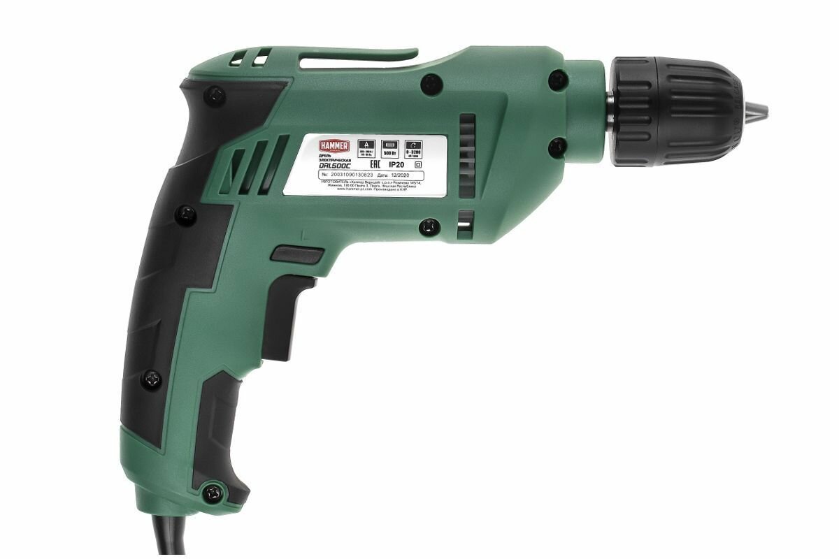 Дрель Hammer DRL500C 500Вт 10мм БЗП 0-3200об/мин реверс Безударная дрель с двигателем мощностью 500 Вт идеально подойдет для точного сверления дерева, металла и кафеля. Благодаря быстрозажимному патрону обеспечивается максимально надежная и быстрая фиксация оснастки. Для точной настройки инструмента в зависимости от материала предусмотрена электронная регулировка оборотов. Извлечь сверло или вывернуть крепеж поможет встроенный реверс кнопочного типа.