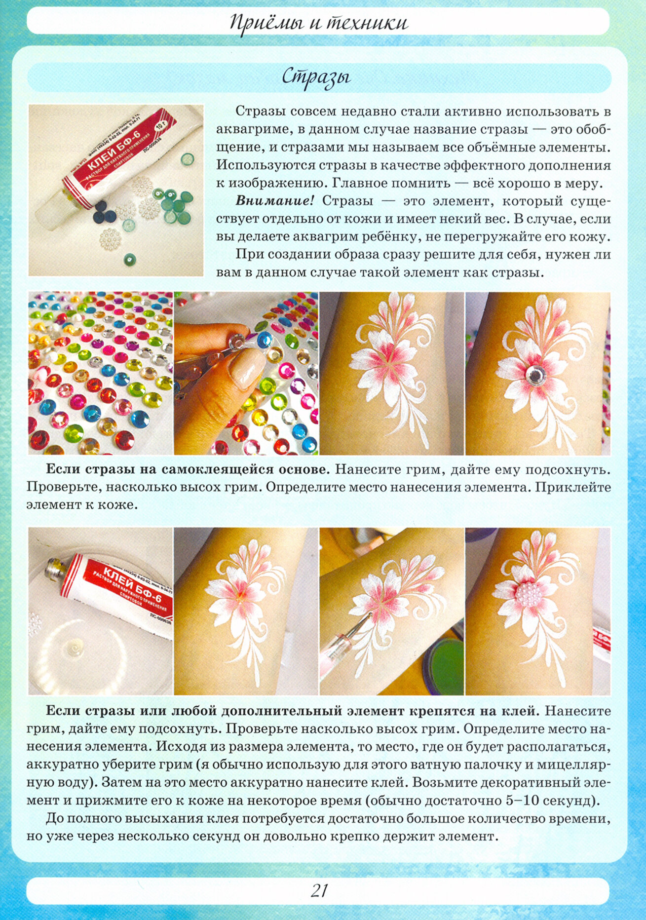 С помощью книги Лидии Кубаревой "Аквагрим. Рисуем сказку" вы сами можете попробовать создать понравившийся образ - главное подойти к этому делу с любовью и фантазией! Вам понадобятся только специальные краски на водной основе, кисти и спонжи, влажные салфетки и 10 минут времени на каждый образ. А научиться рисовать красивые дизайны на детских личиках совсем не сложно, даже если вы не художник. Чёткие пошаговые инструкции и подробные фотографии этой книги не дадут ошибиться. Вы легко превратите детей в чудесных принцесс и котиков, мышек и паучков! Вы подарите детям незабываемое чувство радости и сказки! Попробуйте - и у вас получится! Порадуйте своих детей и их друзей простыми в исполнении, но очень красивыми дизайнами аквагрима! Впрочем, и взрослые тоже с удовольствием перевоплощаются в сказочных персонажей или мифических героев. Веселого вам творчества!