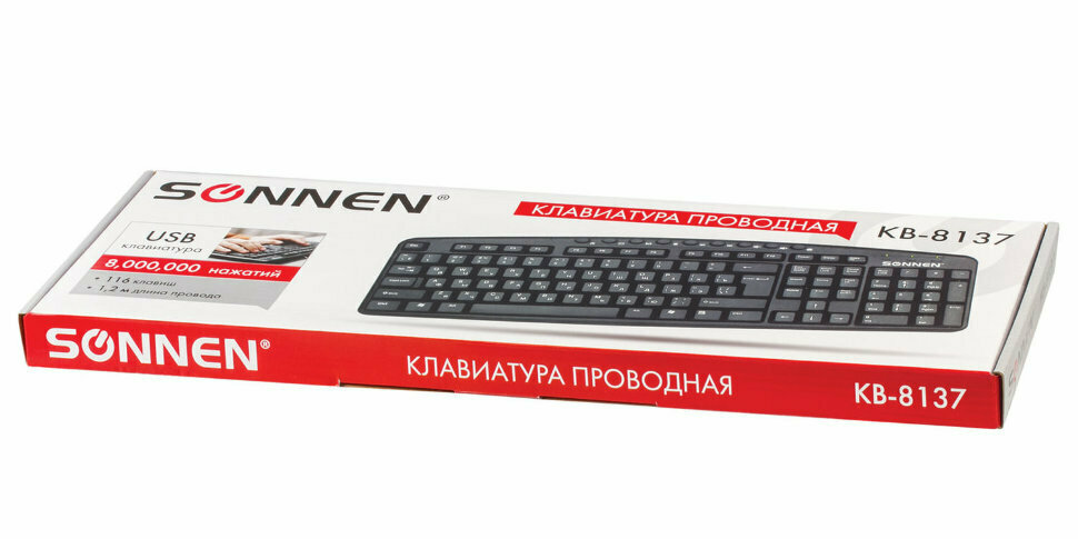 SONNEN KB-8139 - полноразмерная, класическая проводная USB-клавиатура с NUM PAD и 12-ю дополнительными клавишами. Благодаря стандартной раскладке, функциональной и прочной конструкции, на клавиатуре удобно работать дома и в офисе.