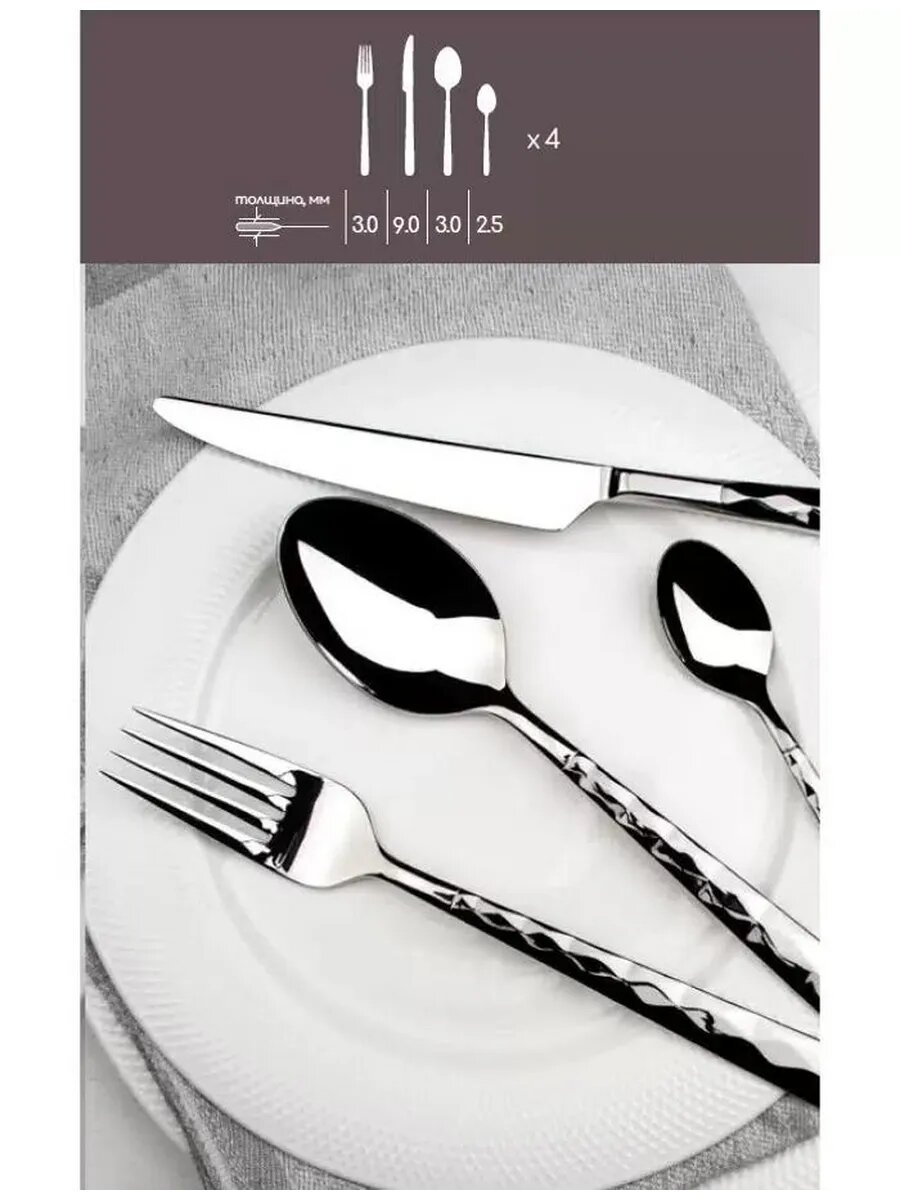 | Состав набора | Ложка столовая - 6 Ложка чайная - 6 Вилка - 6 Нож - 6 |