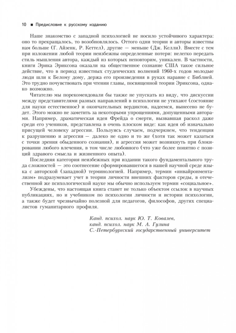 Издание охватывает широкий круг направлений в теории личности, разработанных такими крупнейшими учеными, как Фрейд, Адлер, Юнг, Эриксон, Фромм, Хорни, Кеттел, Айзенк, Скиннер, Бандура, Роттер, Келли, Маслоу, Роджерс. Большинство этих теорий впервые в столь полном объеме представлены на русском языке.