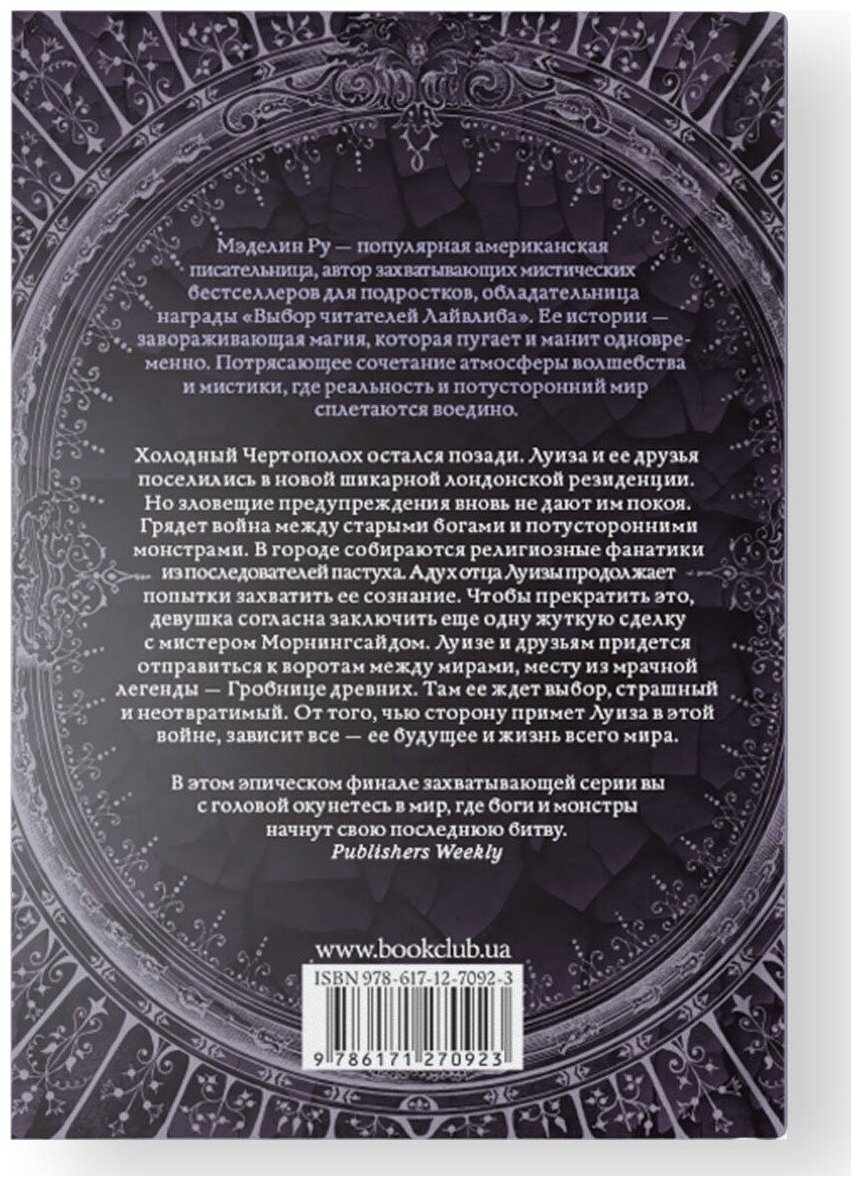 Холодный Чертополох остался позади. Луиза и ее друзья поселились в новой шикарной лондонской резиденции. Но зловещие предупреждения вновь не дают им покоя. Грядет война между старыми богами и потусторонними монстрами. В городе собираются религиозные фанатики из последователей пастуха. А дух отца Луизы продолжает попытки захватить ее сознание. Чтобы прекратить это, девушка согласна заключить еще одну жуткую сделку с мистером Морнингсайдом. Луизе и друзьям придется отправиться к воротам между мирами, месту из мрачной легенды - Гробнице древних. Там ее ждет выбор, страшный и неотвратимый. От того, чью сторону примет Луиза в этой войне, зависит все - ее будущее и жизнь всего мира.
