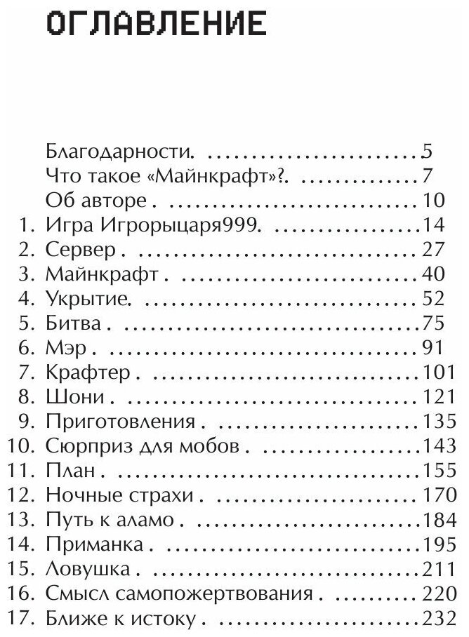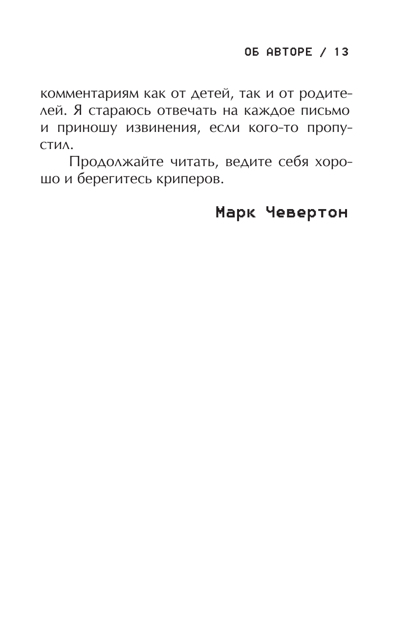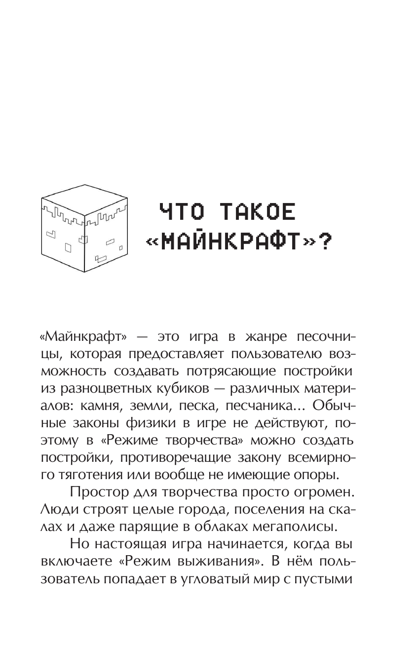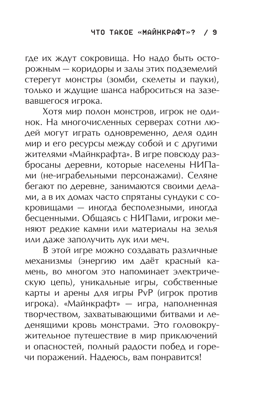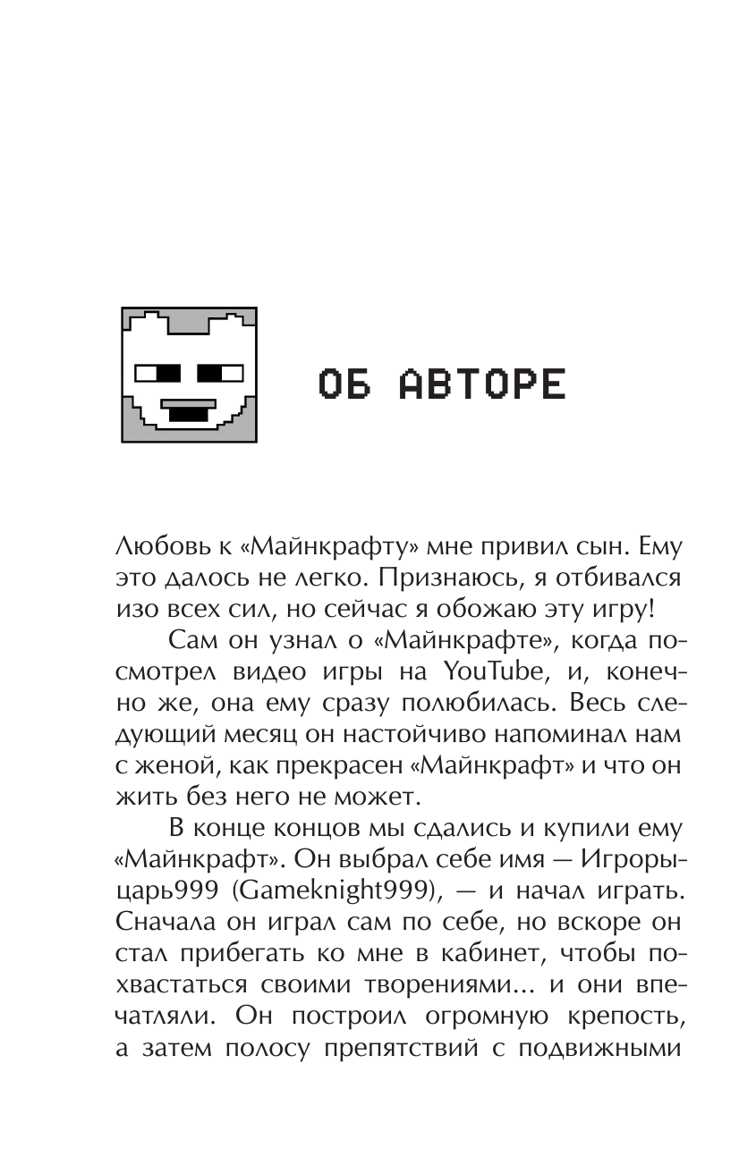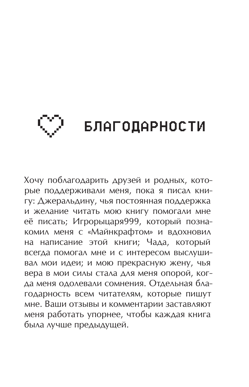 Мне очень нравится эта книга.Я играю в Майнкрафт где то с 5-6 лет и много чего о нём знаю .Мне сейчас 13 и версия сегодняшнего Майнкрафта 1.16.0.64.Всё в книге замечательно но есть 1 но книга вышла в лит рес недавно а так написана в 2014 .В то времЯ в Майнкрафте нельзя было добыть с овец еду по сравнению с нынешней версией где это возможно .И в книге об этом говориться так что это немного смущает но в этом нет ошибки автора.Так что я ставлю 5 звездулек