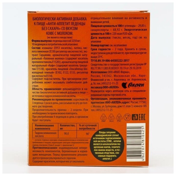 Анти-аппетит леденцы без сахара со вкусом кофе с молоком 325г 10шт ООО ИНАТ-ФАРМА (1090391)
