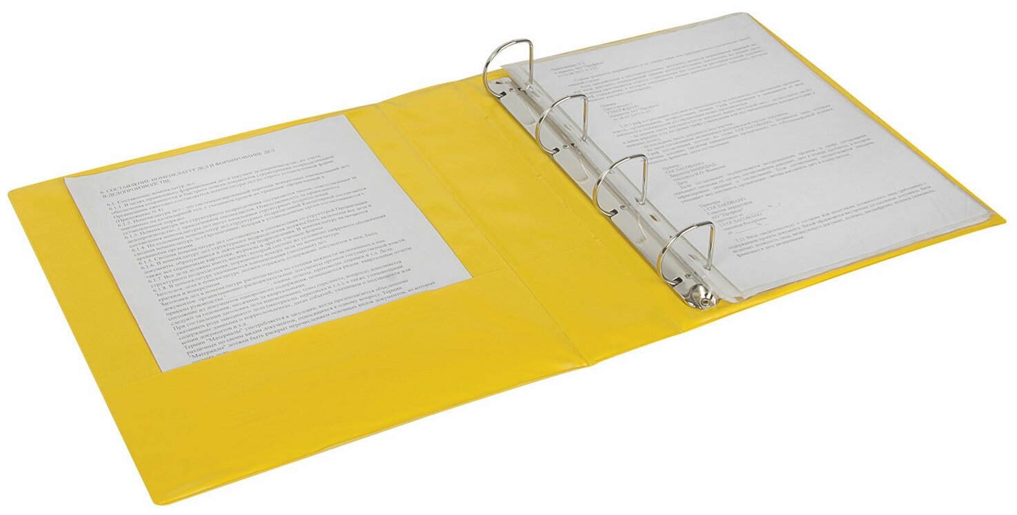 Папка на 4 кольцах BRAUBERG картон/ПВХ с передним прозрачным карманом 50 мм желтая до 300 листов 223533