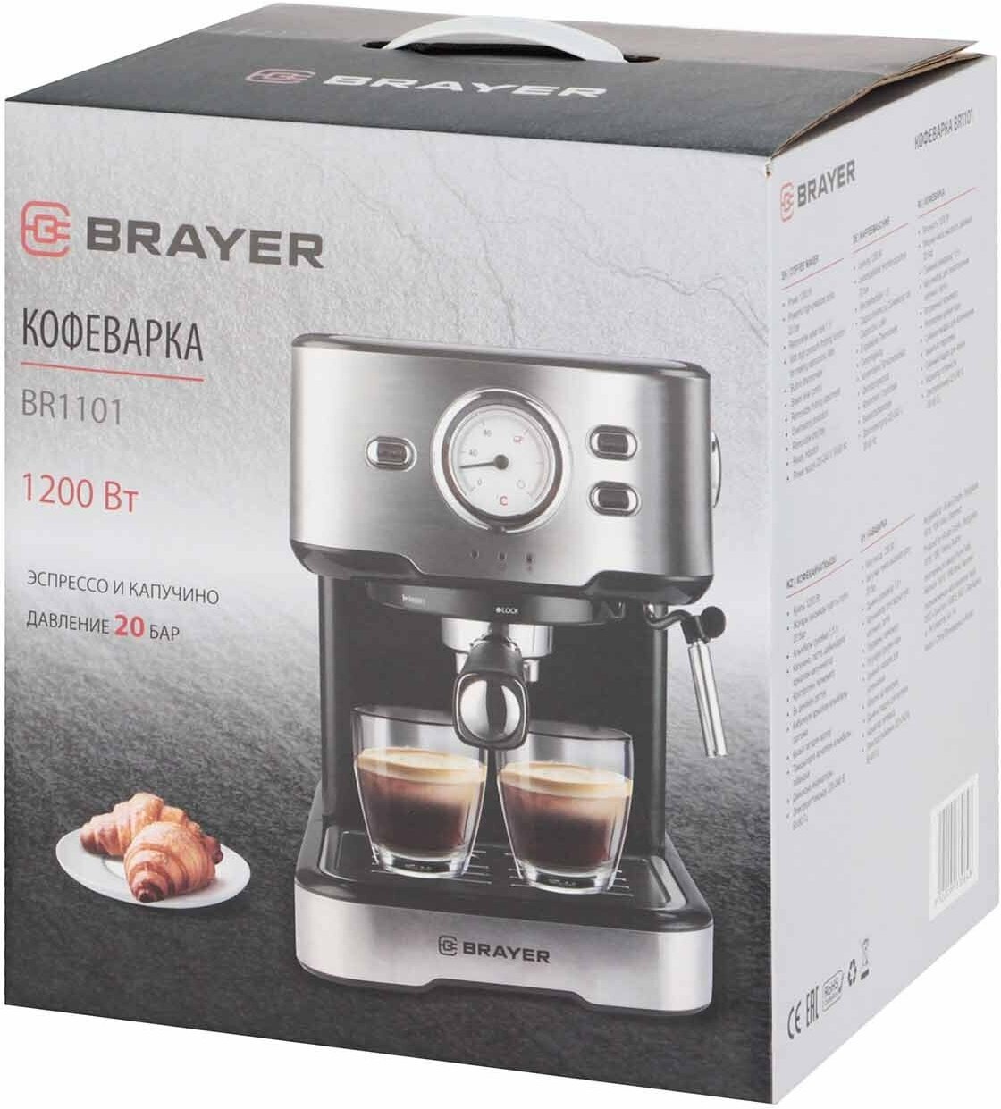 1101BR Кофеварка рожковая BRAYER 15 л 1200 Вт 20 бар капучинатор термометр BR1101