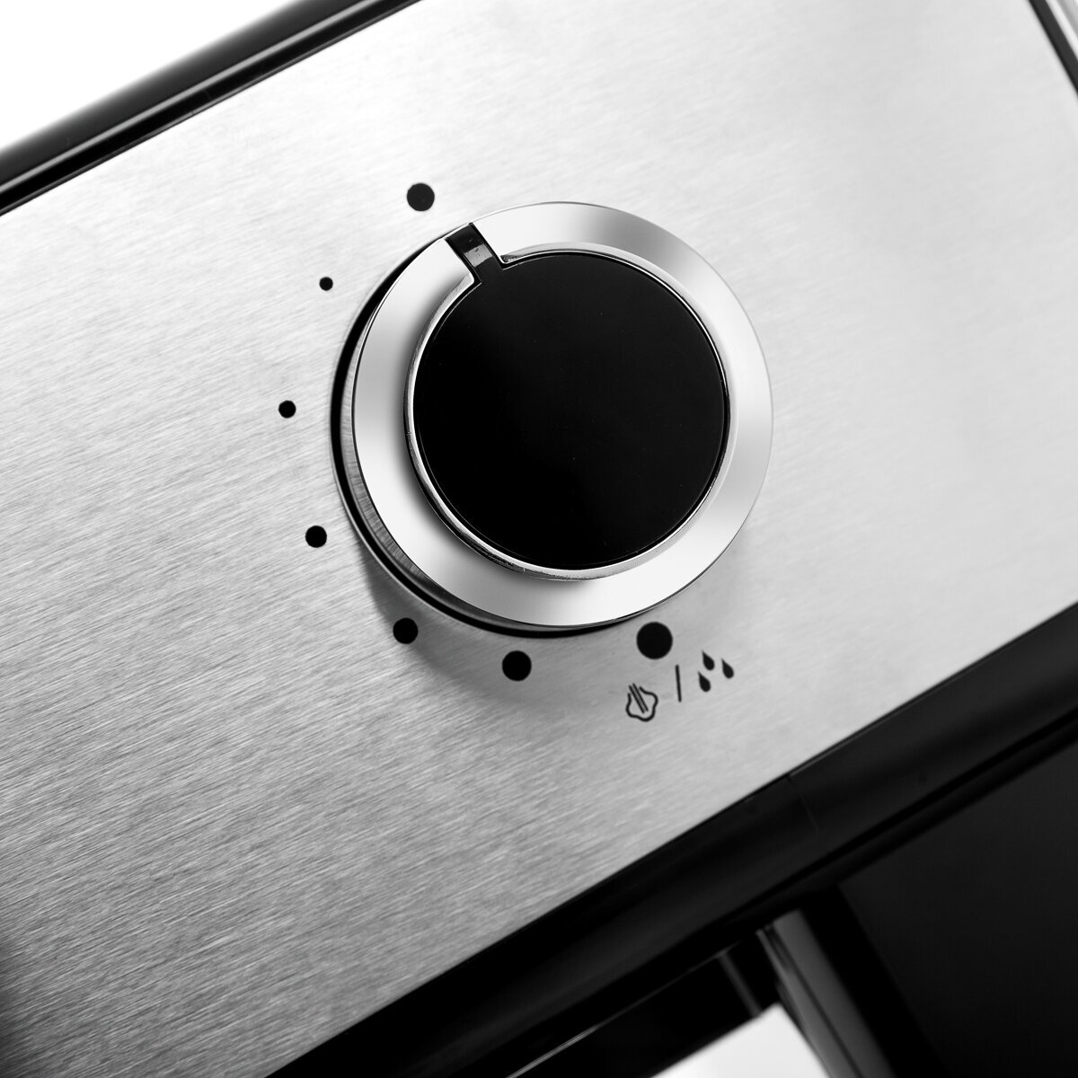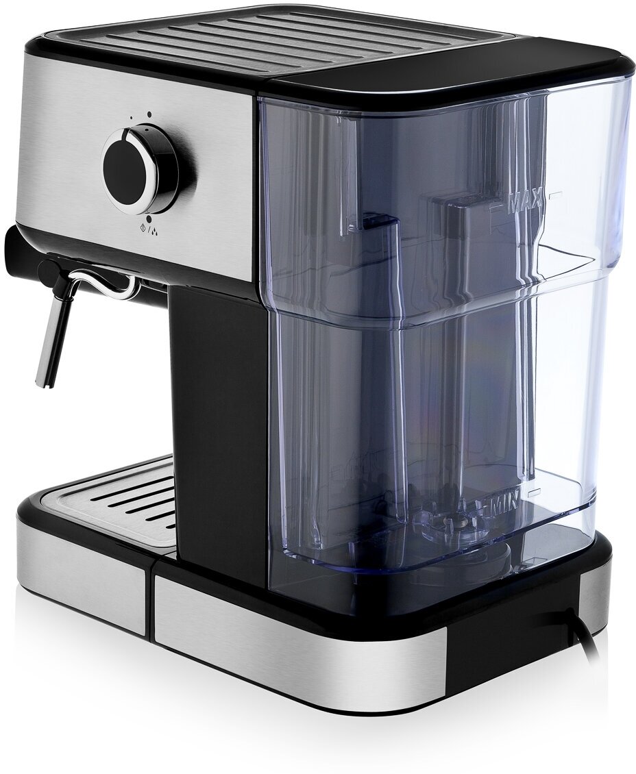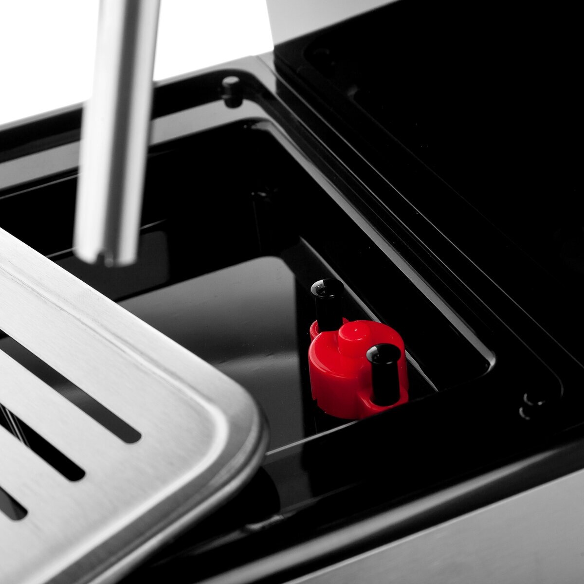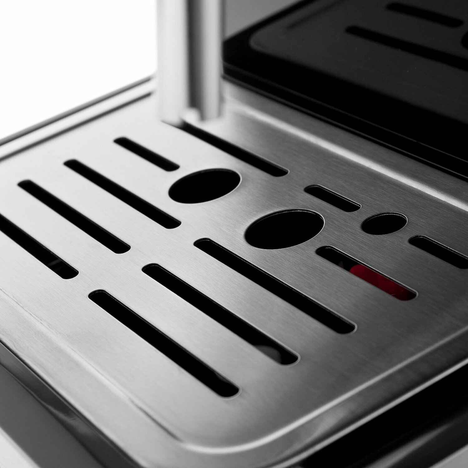 Рожковая кофеварка мощностью 1200 Вт, давление 20 бар. Электронное управление. Контейнер для воды 1.5 л. Автоматическое отключение. Одновременное приготовление 2 порций. Ручной капучинатор. Съемный лоток для капель.