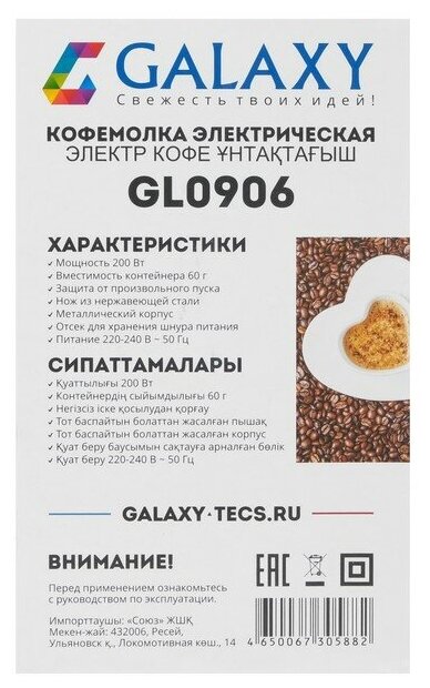 Кофемолка Galaxy – стильный дизайн и прочный корпус! Ротационный нож выполнен из нержавеющей стали, что гарантирует надежность и значительно увеличивает срок службы. Благодаря наличию импульсного режима работы обеспечивается более тщательное измельчение особо твердых продуктов. Вместимость чаши для кофе составляет 60 грамм, этого будет вполне достаточно на несколько полноценных чашек кофе. Кофемолка оснащена функцией блокировки при открытой крышке.